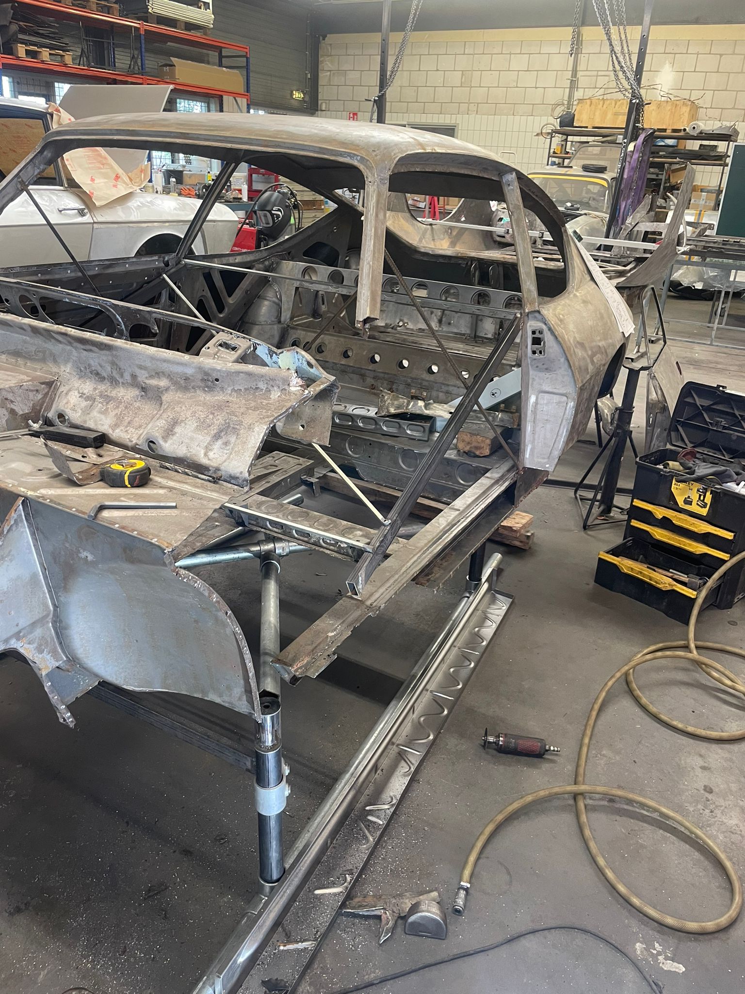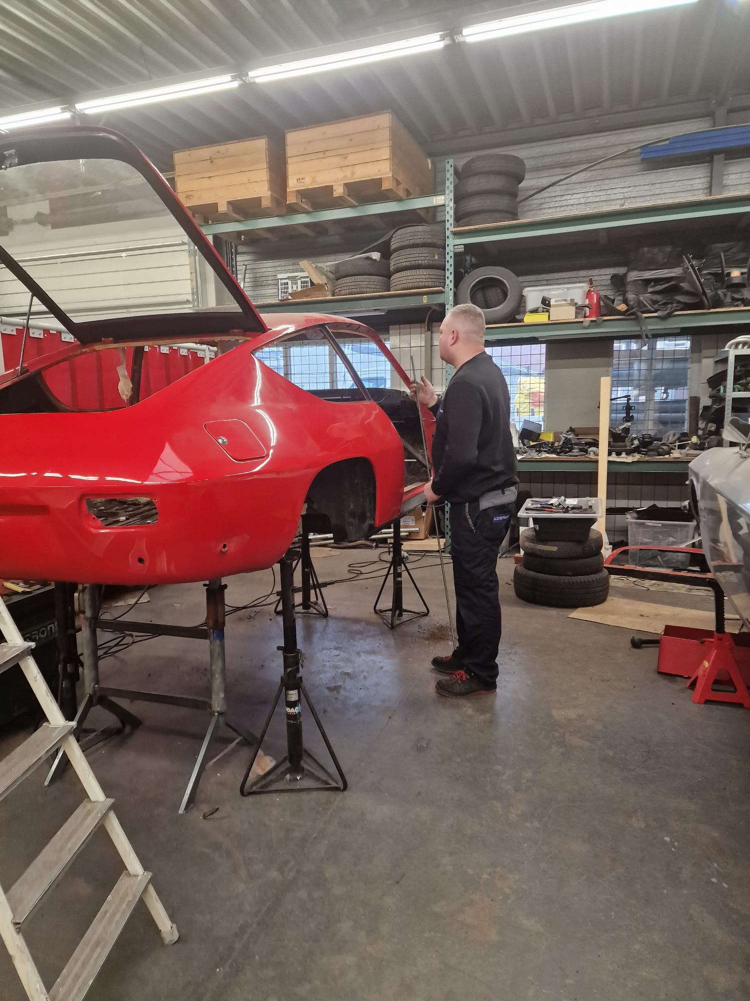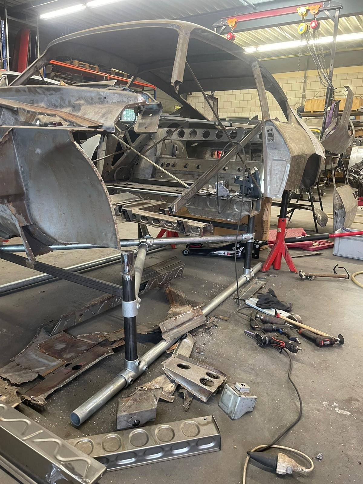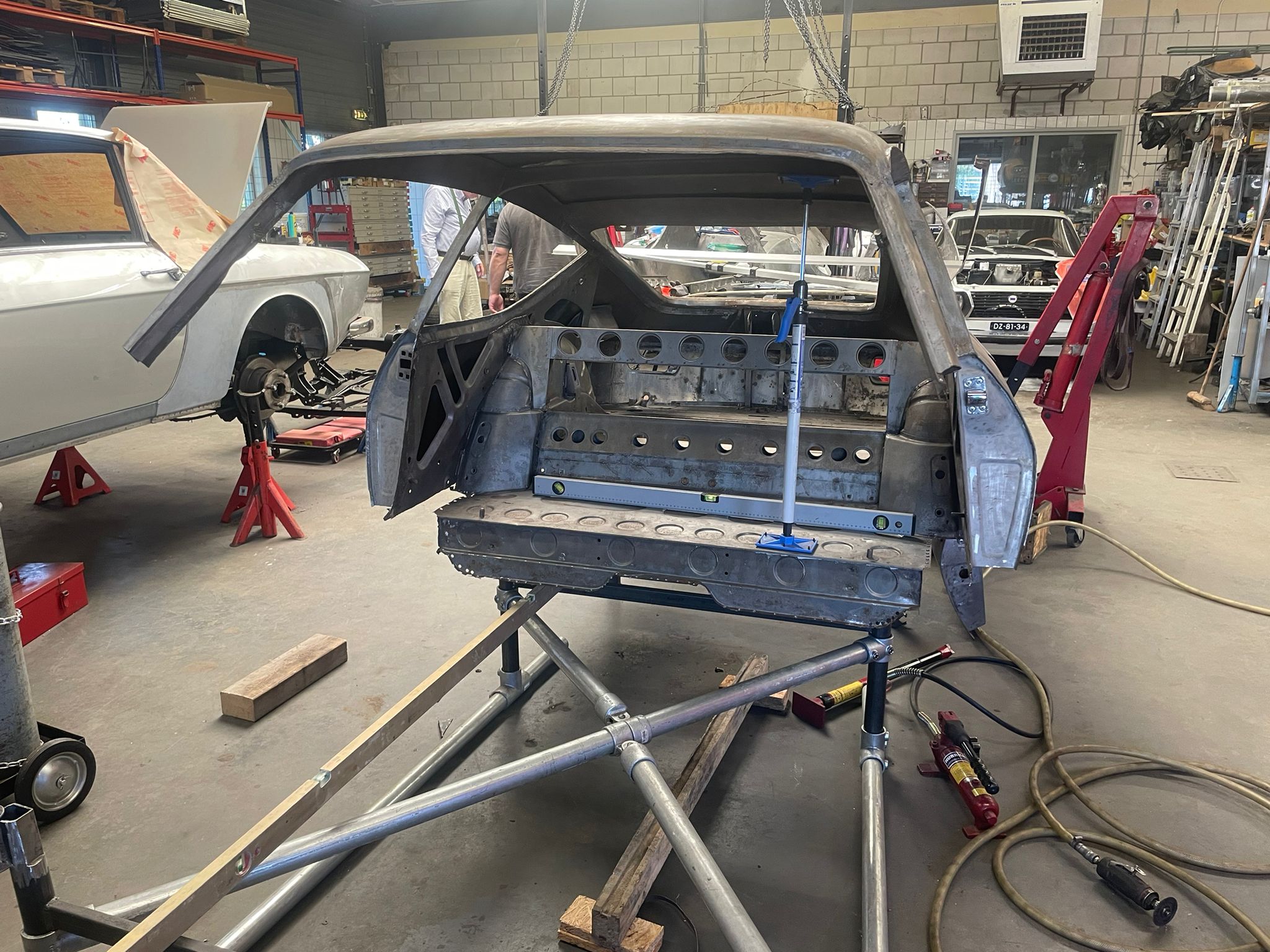 Diagonal crossbars fixate both front and rear referencepoints. And a few extra bars to fixate the length. Together with Wainer we took our time to make sure to level the car out on the concrete floor that wasn’t level so the car is now completely level and fixated on the jig