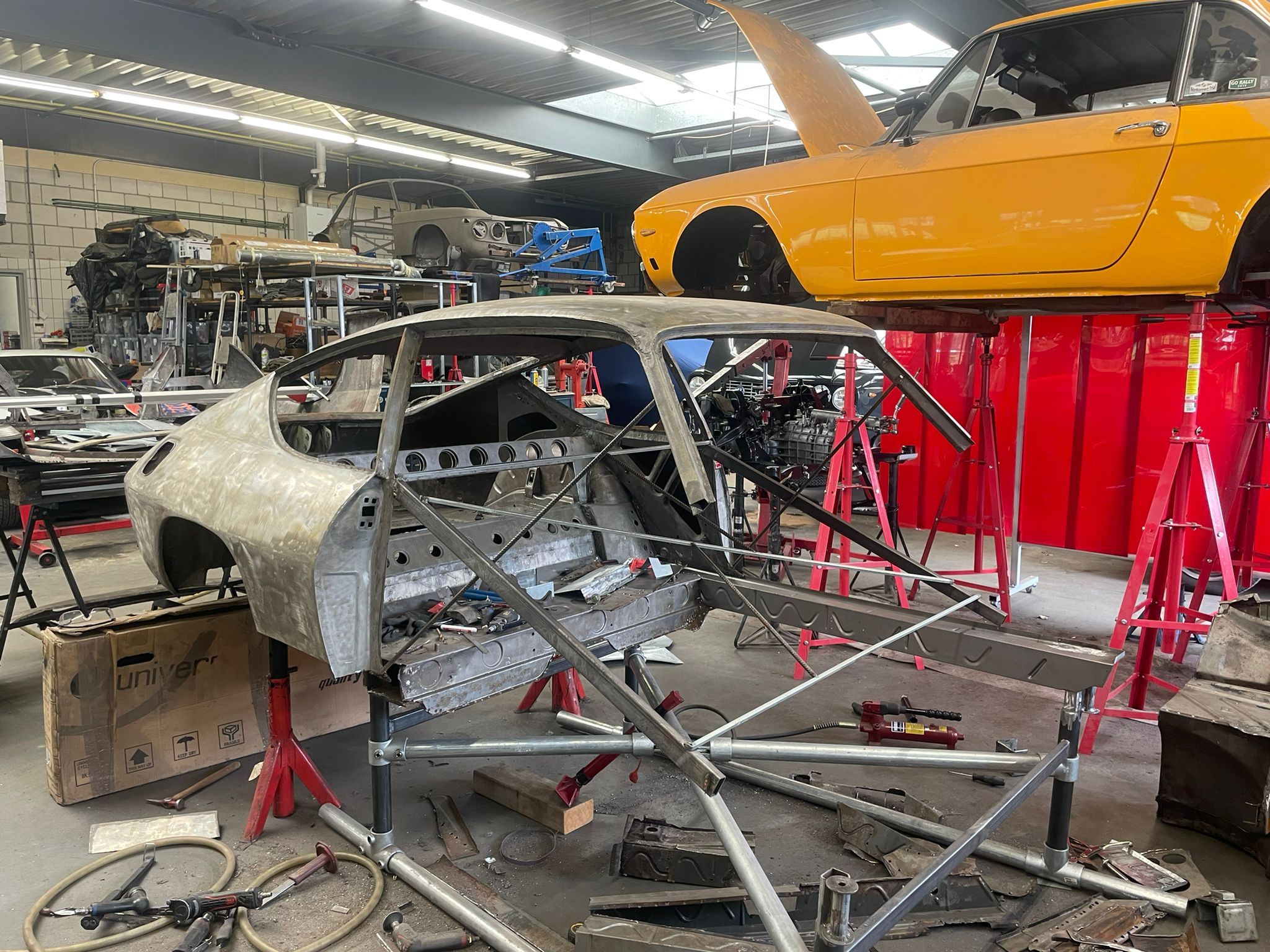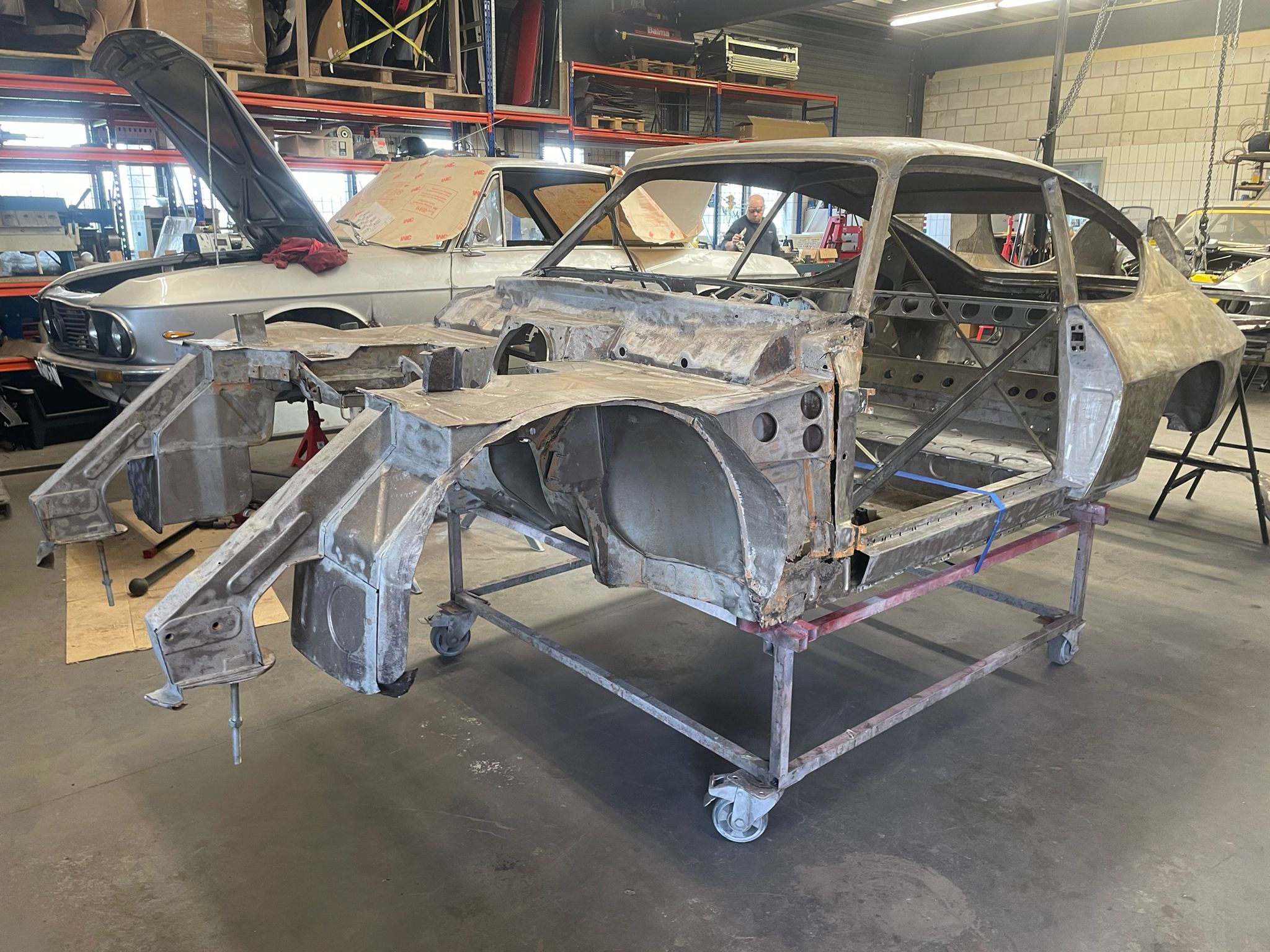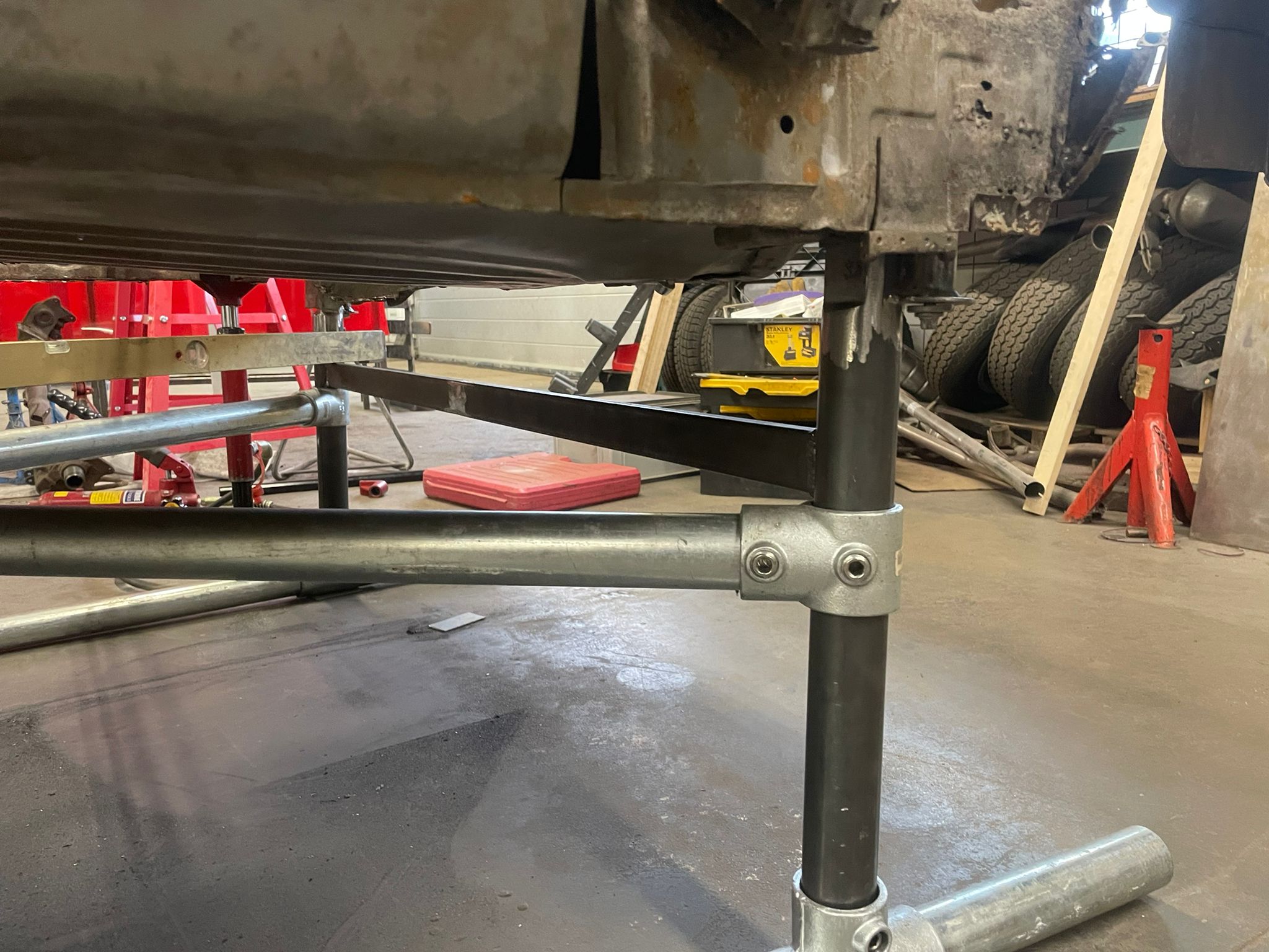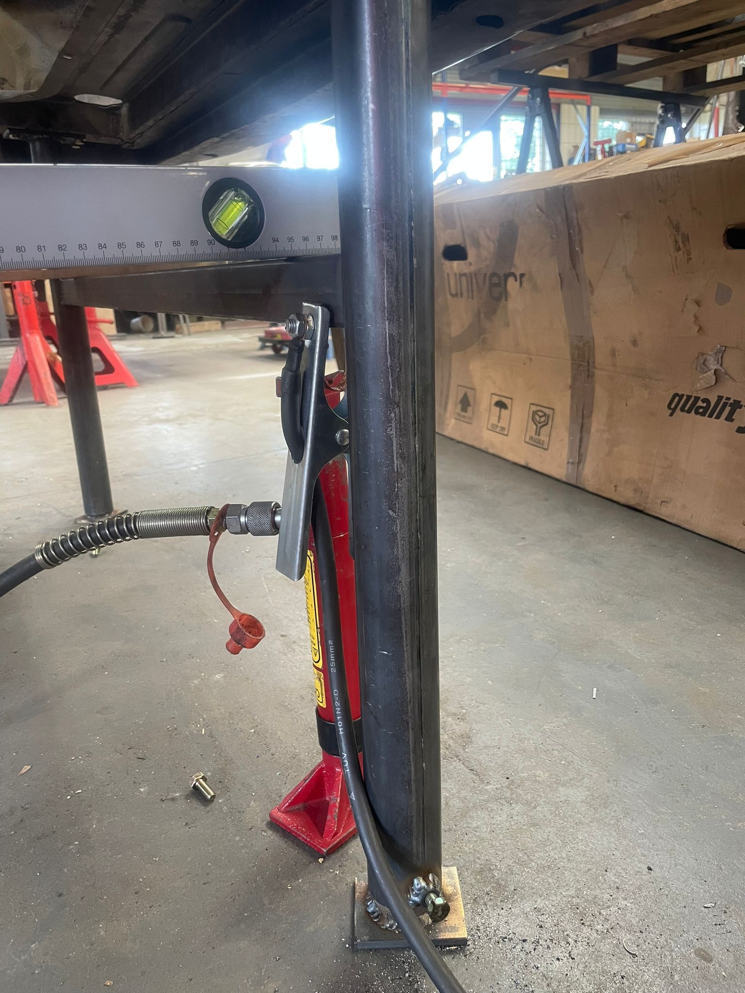 Diagonal crossbars fixate both front and rear referencepoints. And a few extra bars to fixate the length. Together with Wainer we took our time to make sure to level the car out on the concrete floor that wasn’t level so the car is now completely level and fixated on the jig