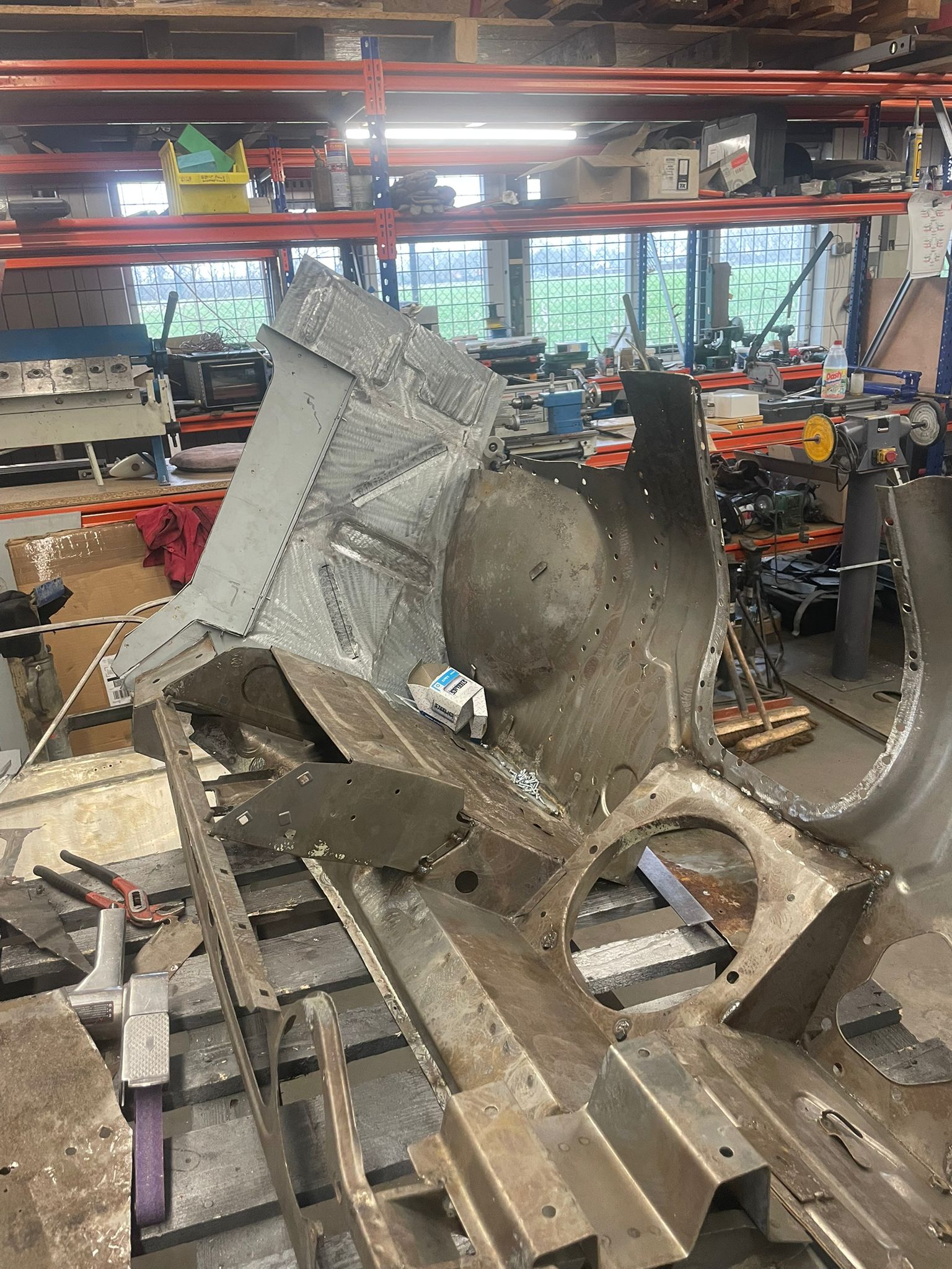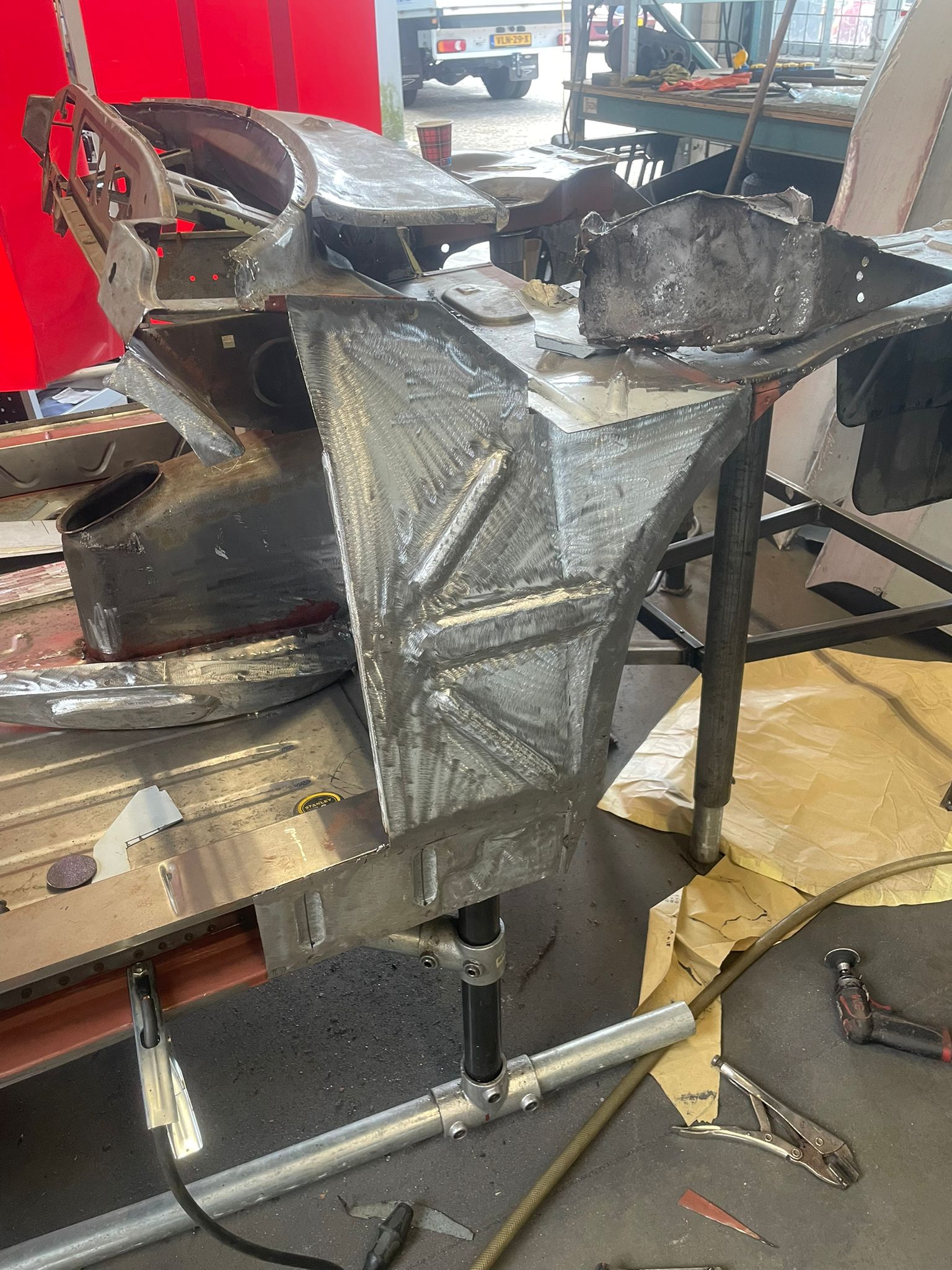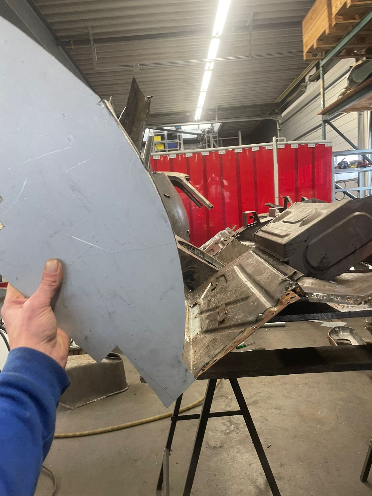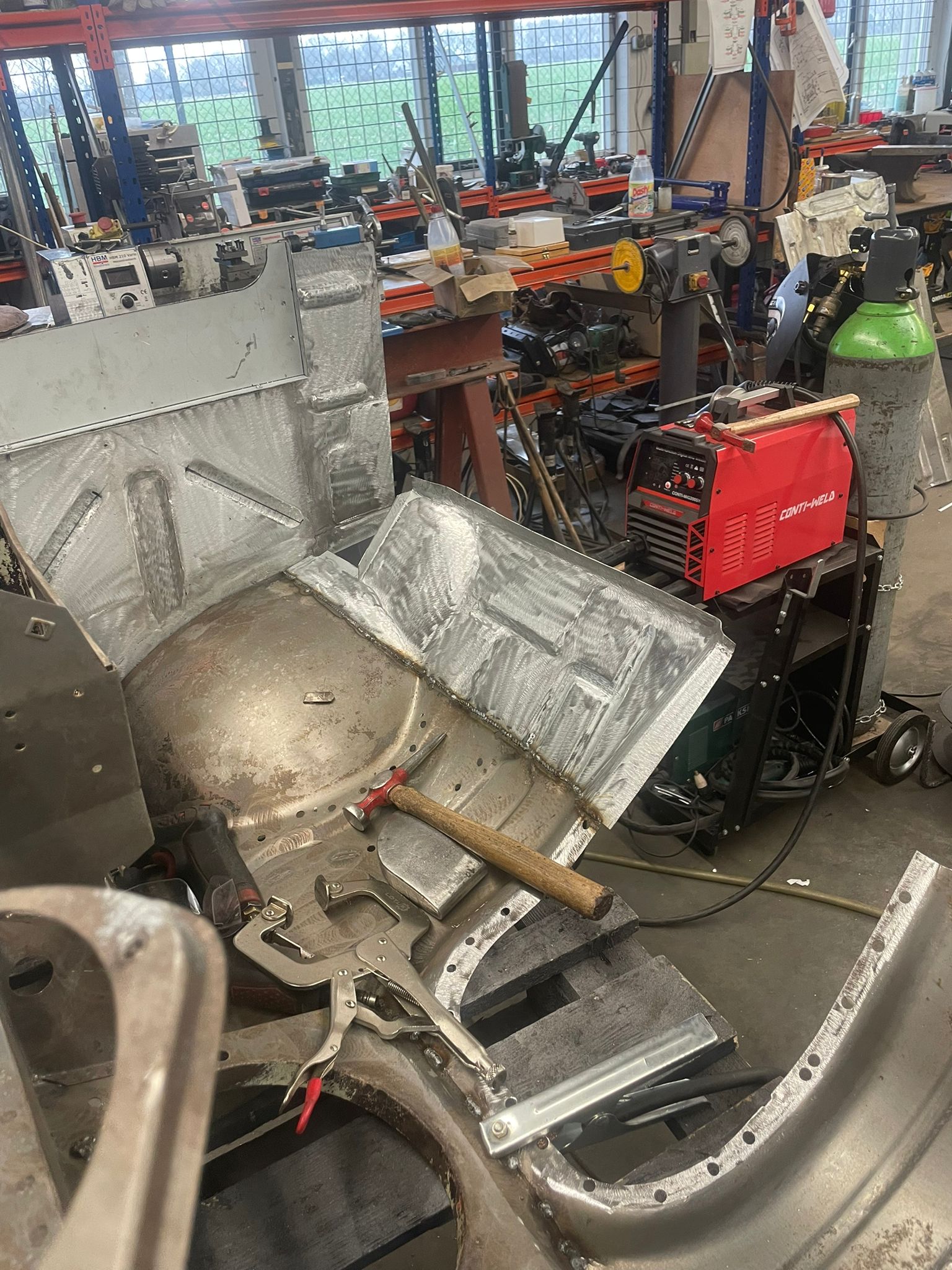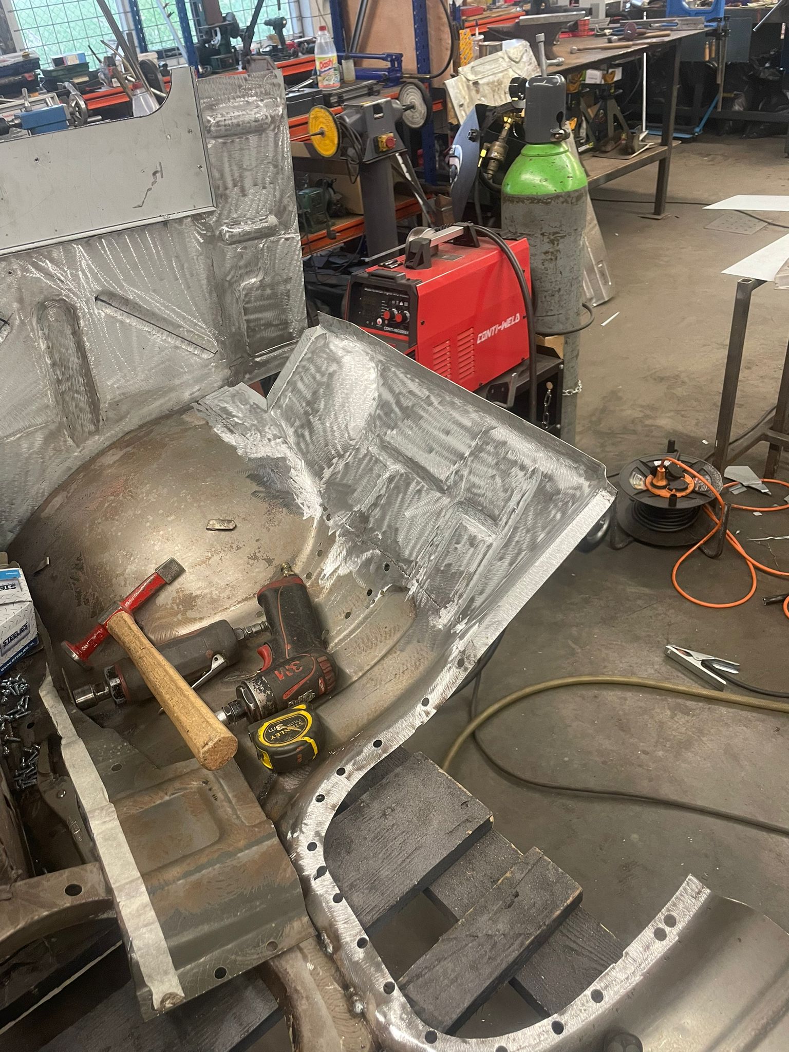 Another week on the zagato. Not a lot of pictures but a lot has happened. I repaired the uppercorners of the firewall. Changed the side profile of the driversside to match the passengerside. Knocked out some dents and stretched the driversside a little bit. Then located every stresscrack, knocked it flat and rewelded it. Remade the lower 20cm of the firewall and the passengerside already welded in after connecting the sidepanels to the firewall.
