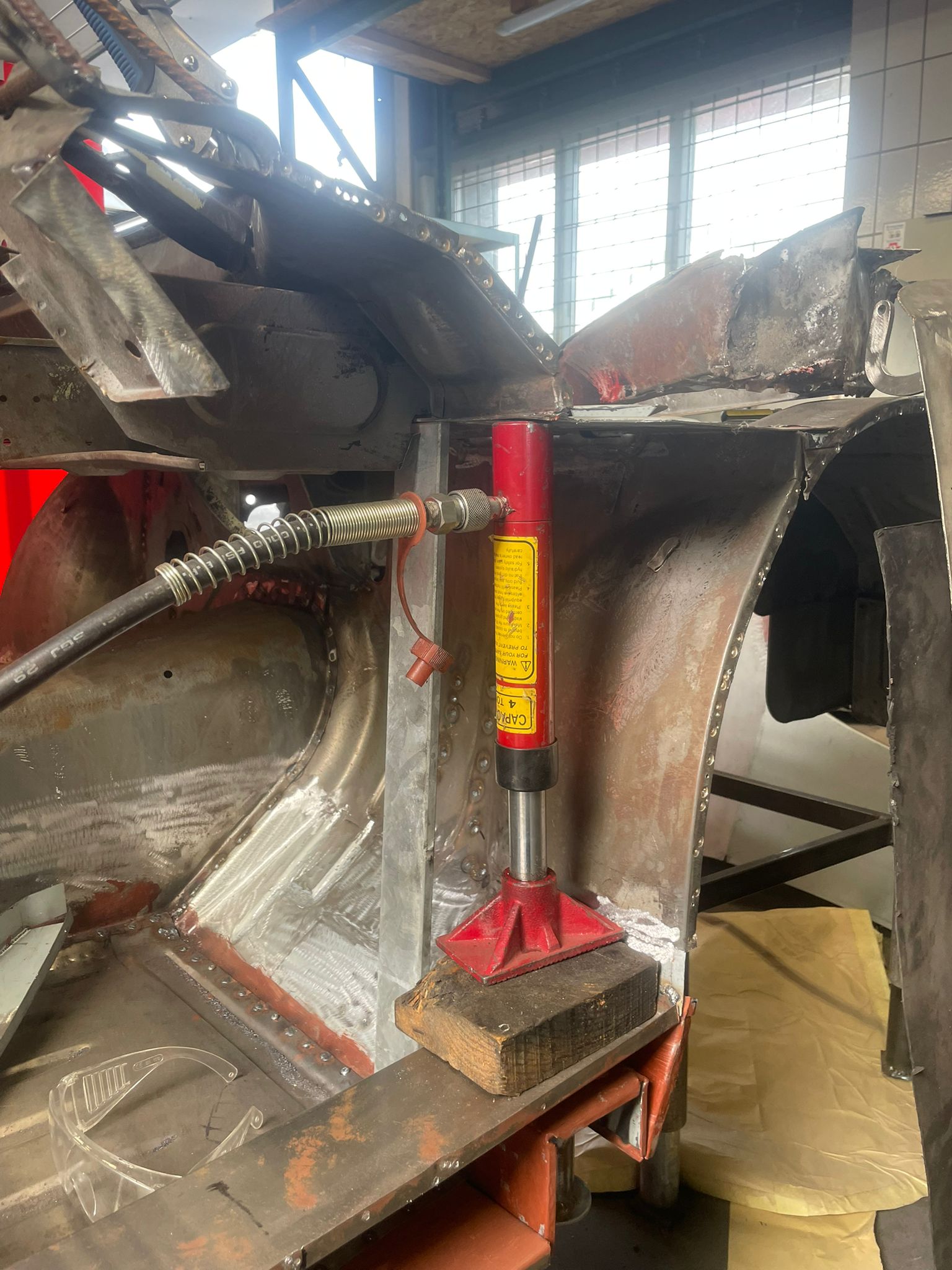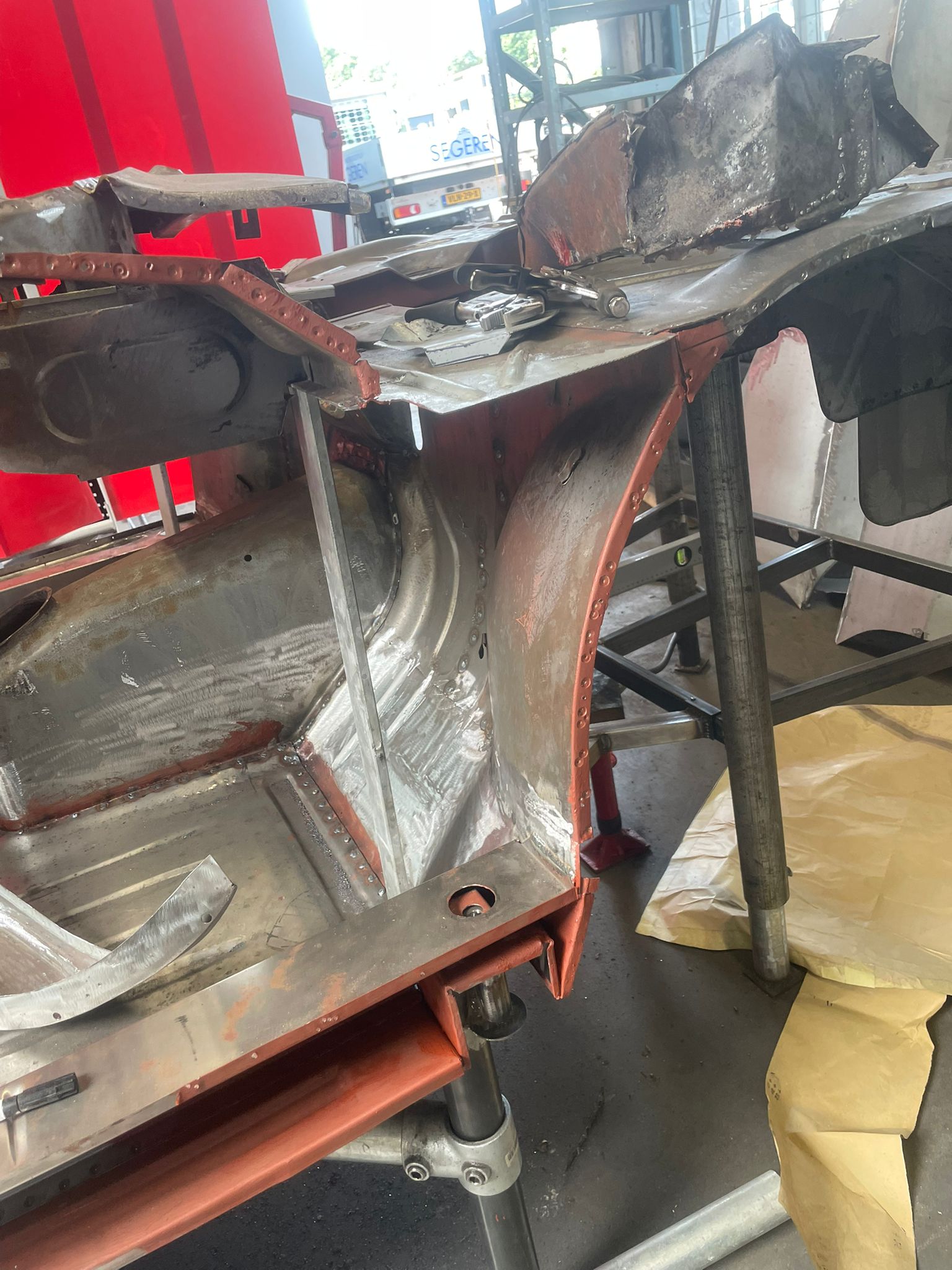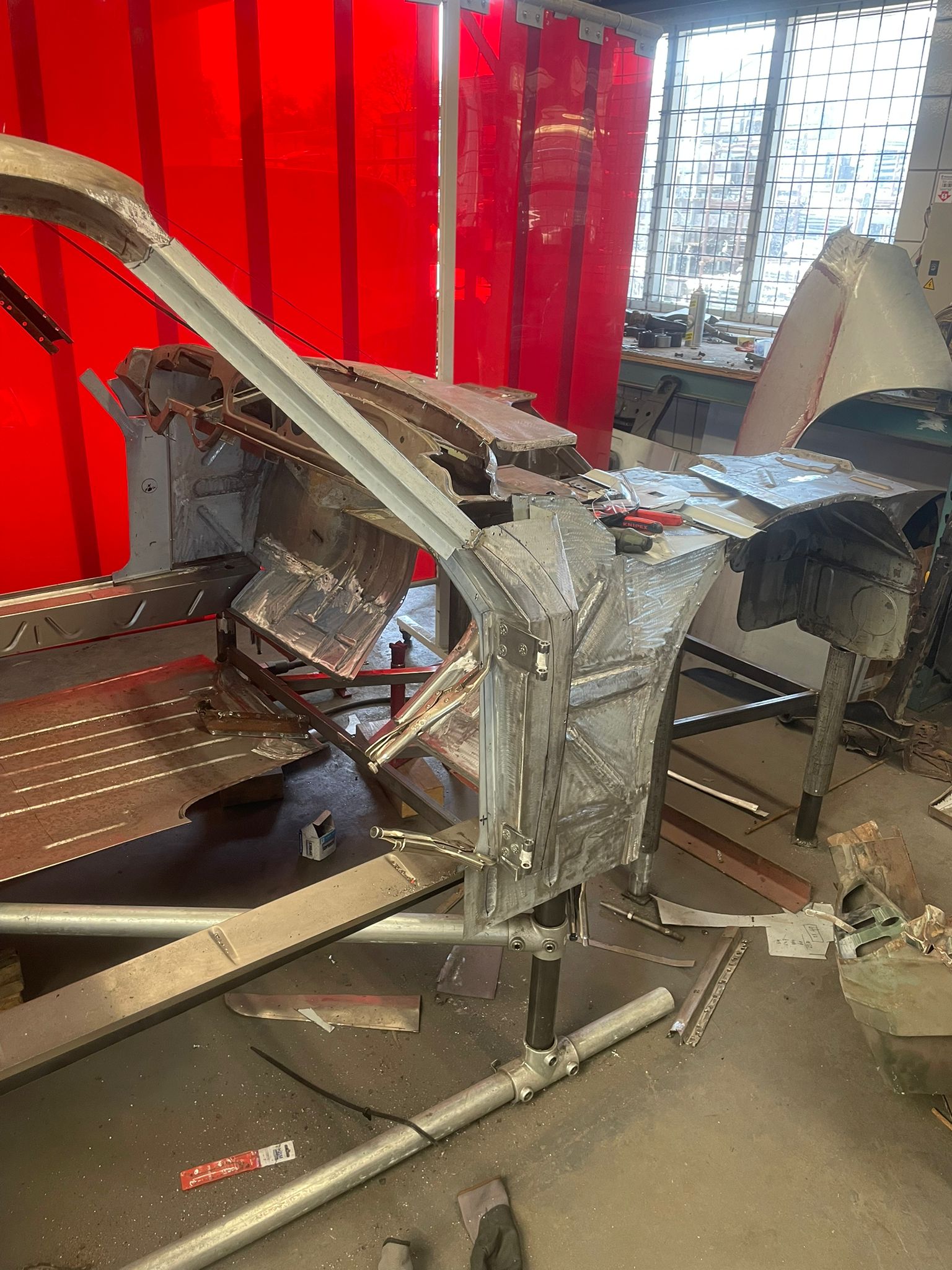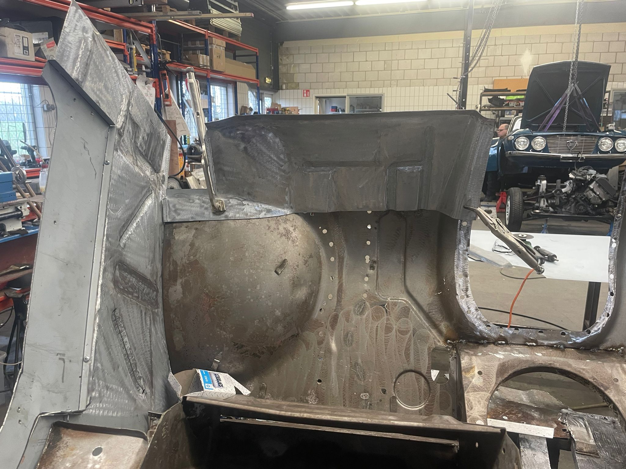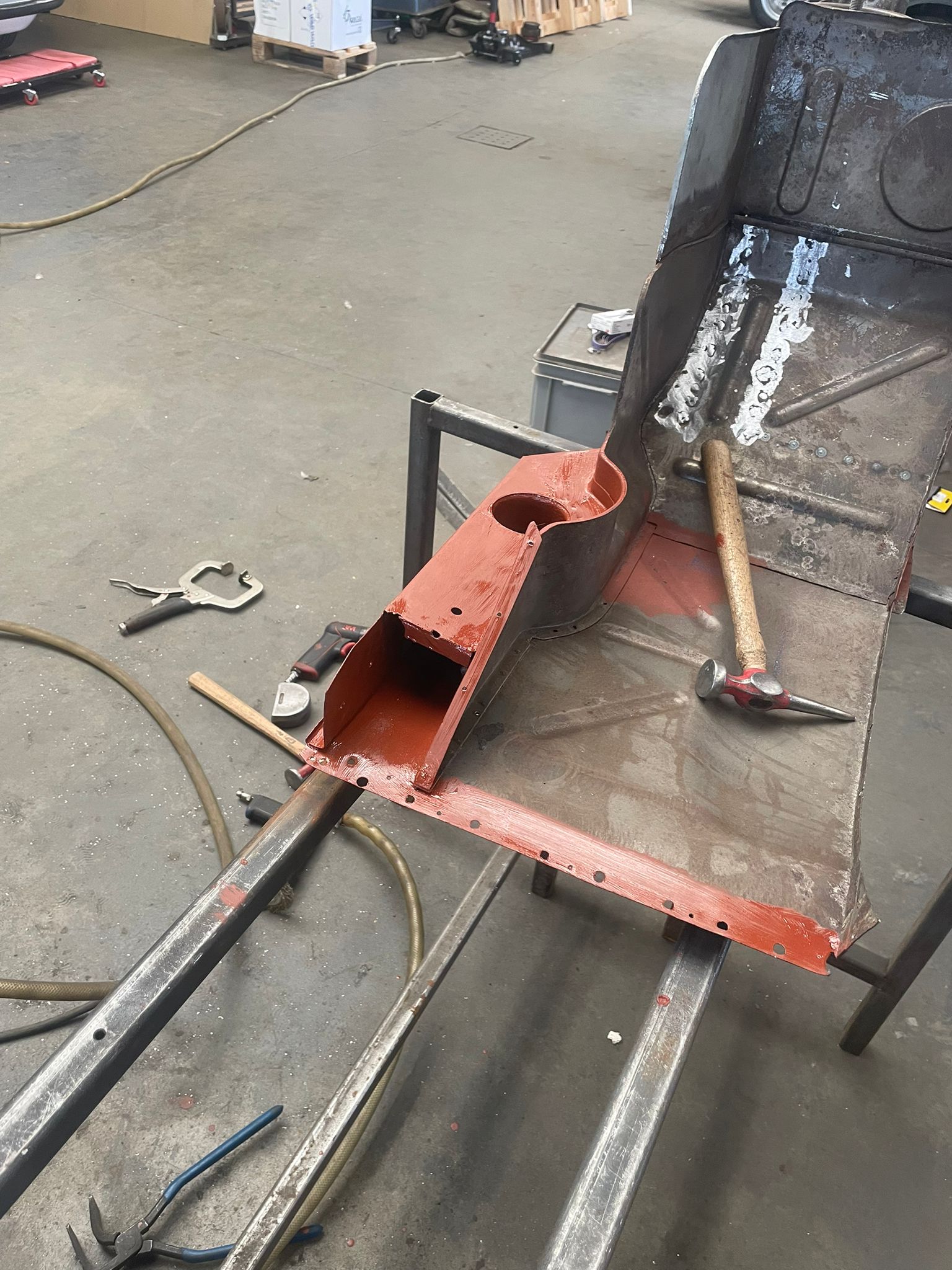 Another week on the zagato. Not a lot of pictures but a lot has happened. I repaired the uppercorners of the firewall. Changed the side profile of the driversside to match the passengerside. Knocked out some dents and stretched the driversside a little bit. Then located every stresscrack, knocked it flat and rewelded it. Remade the lower 20cm of the firewall and the passengerside already welded in after connecting the sidepanels to the firewall.