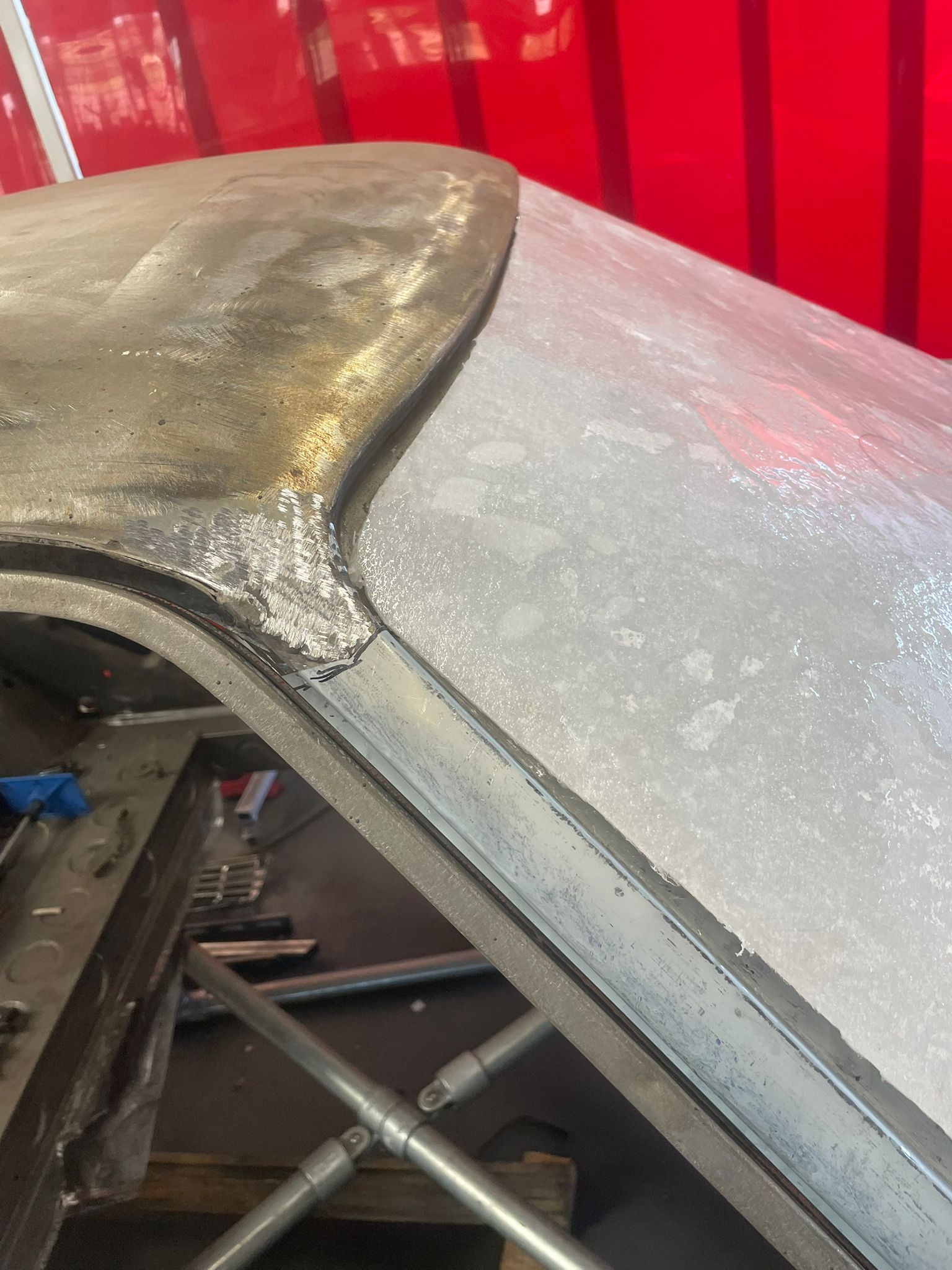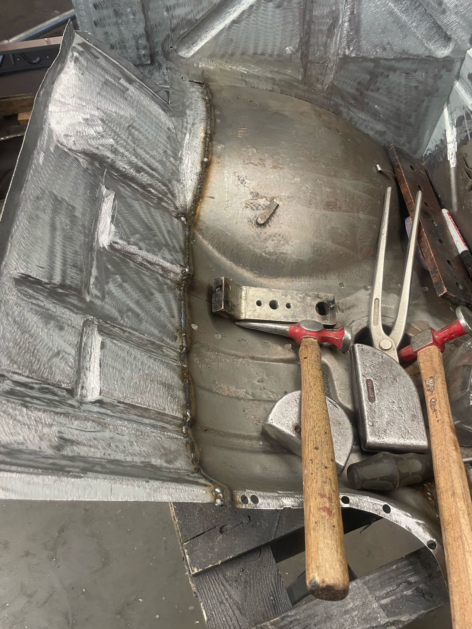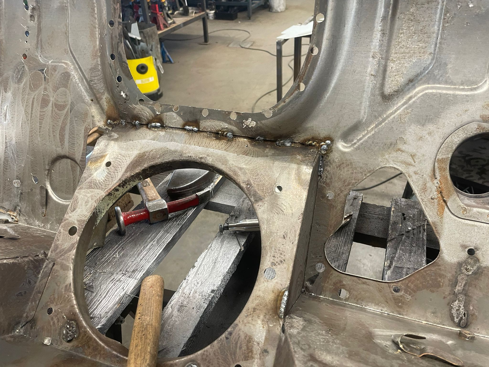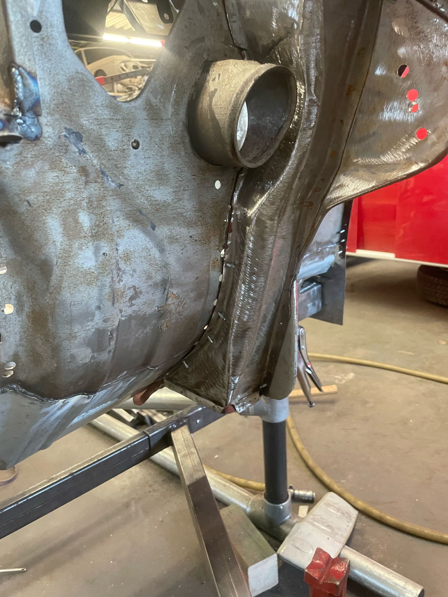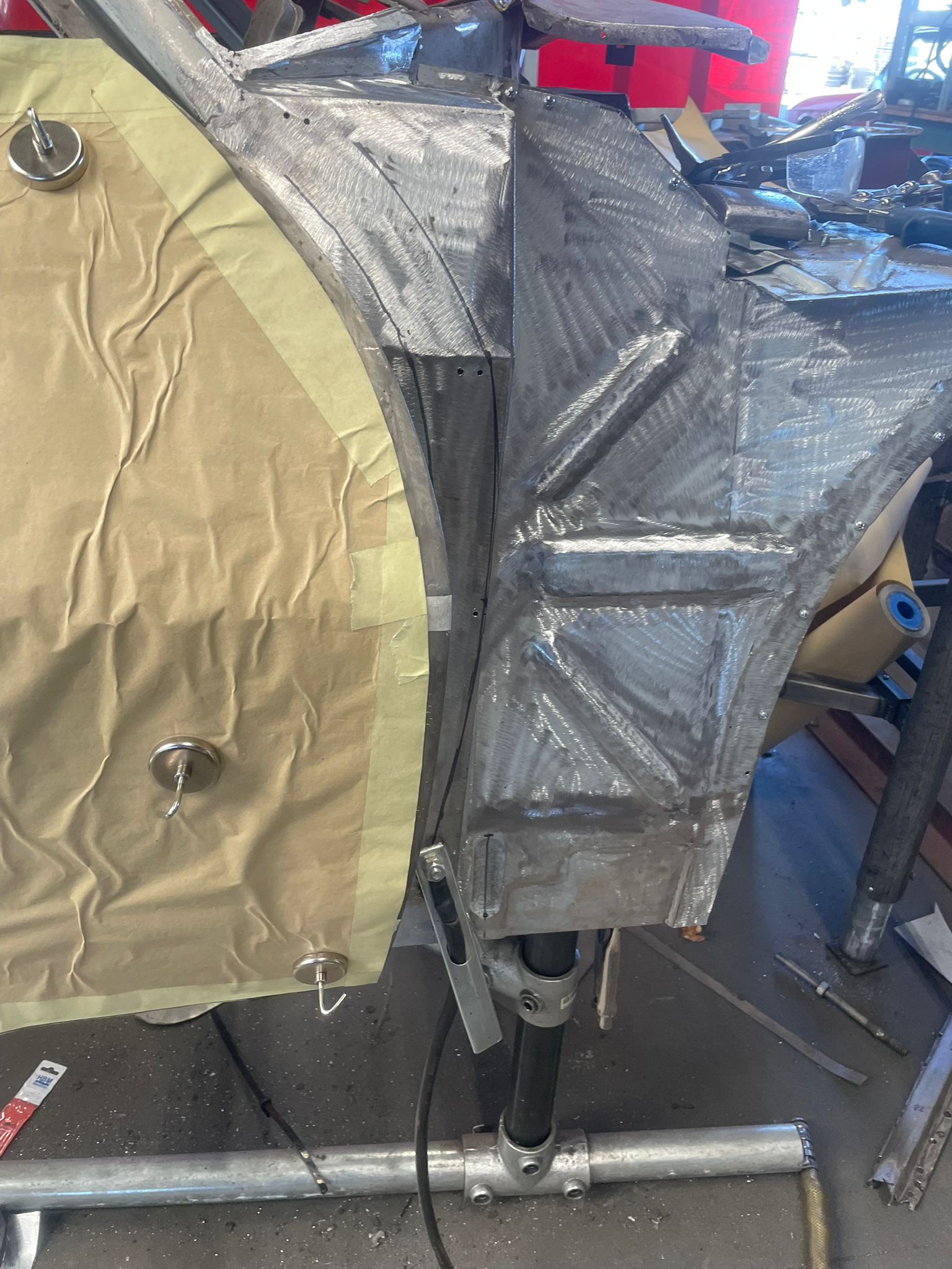 Another week on the zagato. Not a lot of pictures but a lot has happened. I repaired the uppercorners of the firewall. Changed the side profile of the driversside to match the passengerside. Knocked out some dents and stretched the driversside a little bit. Then located every stresscrack, knocked it flat and rewelded it. Remade the lower 20cm of the firewall and the passengerside already welded in after connecting the sidepanels to the firewall.