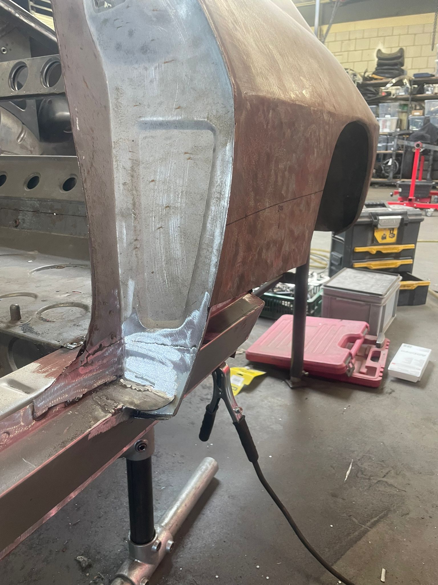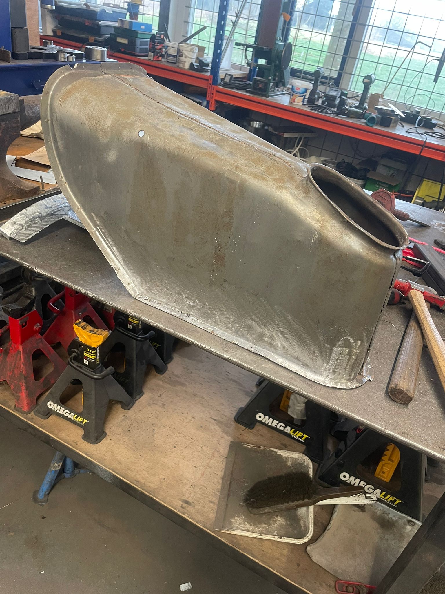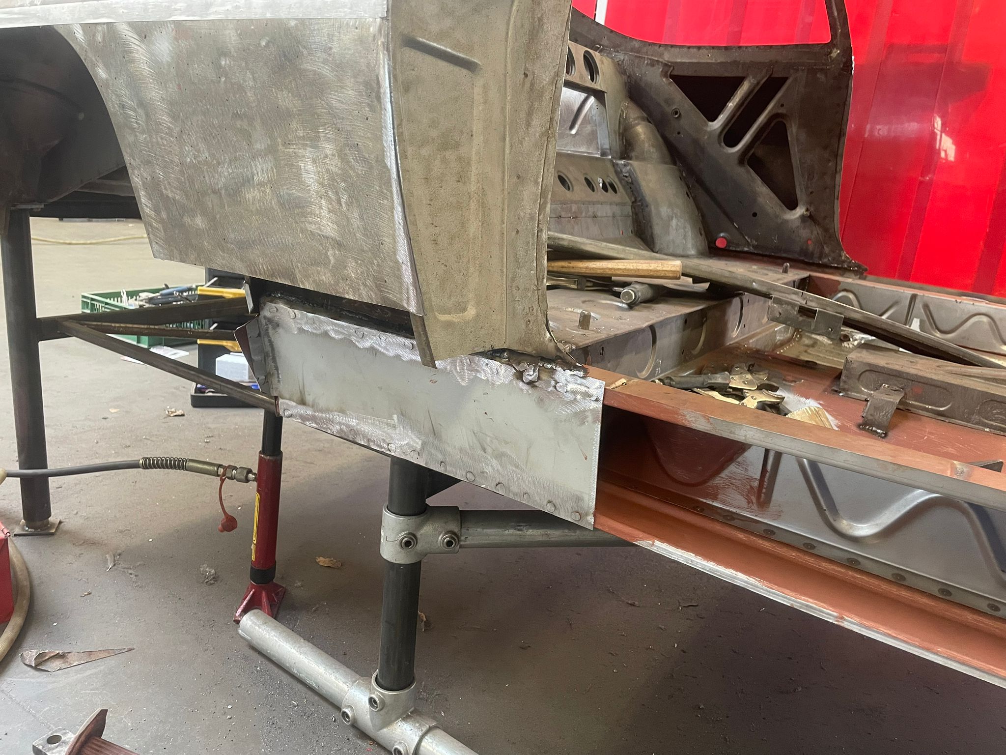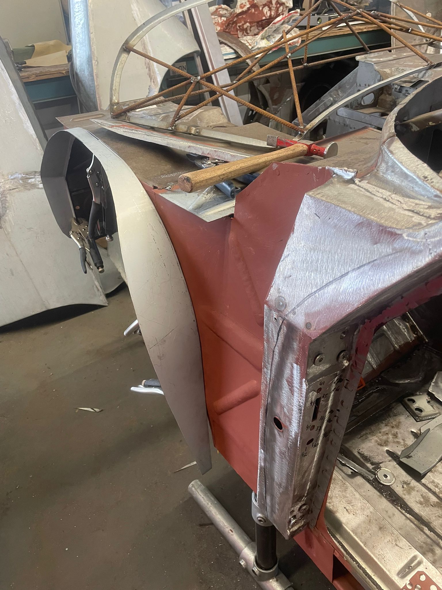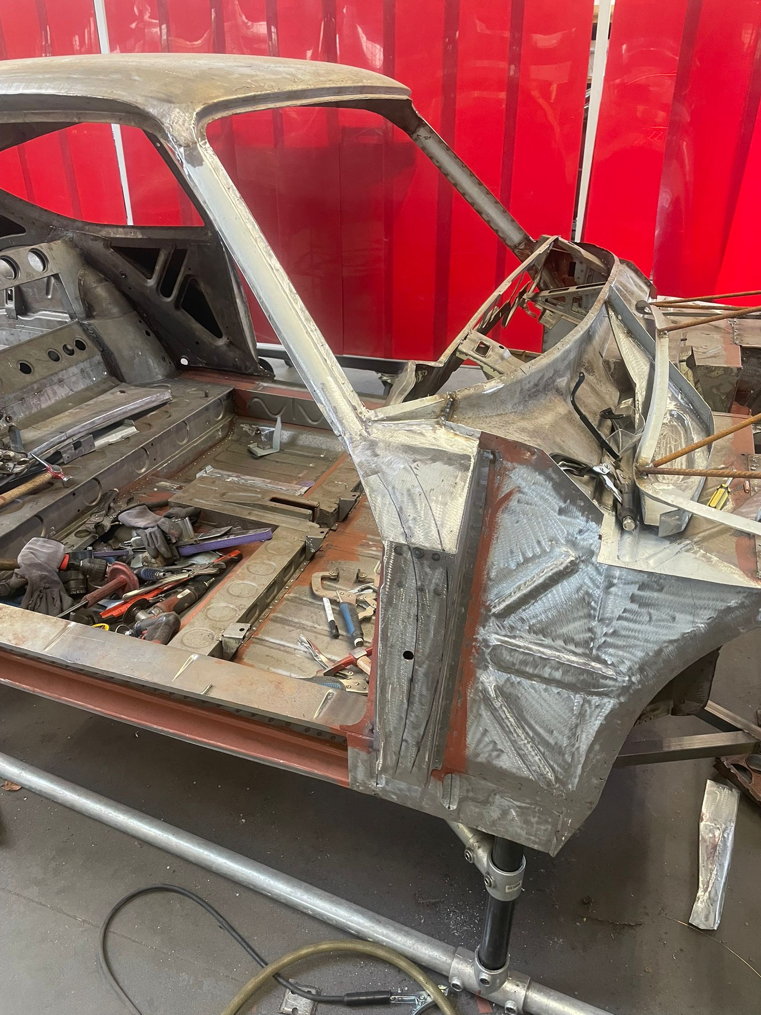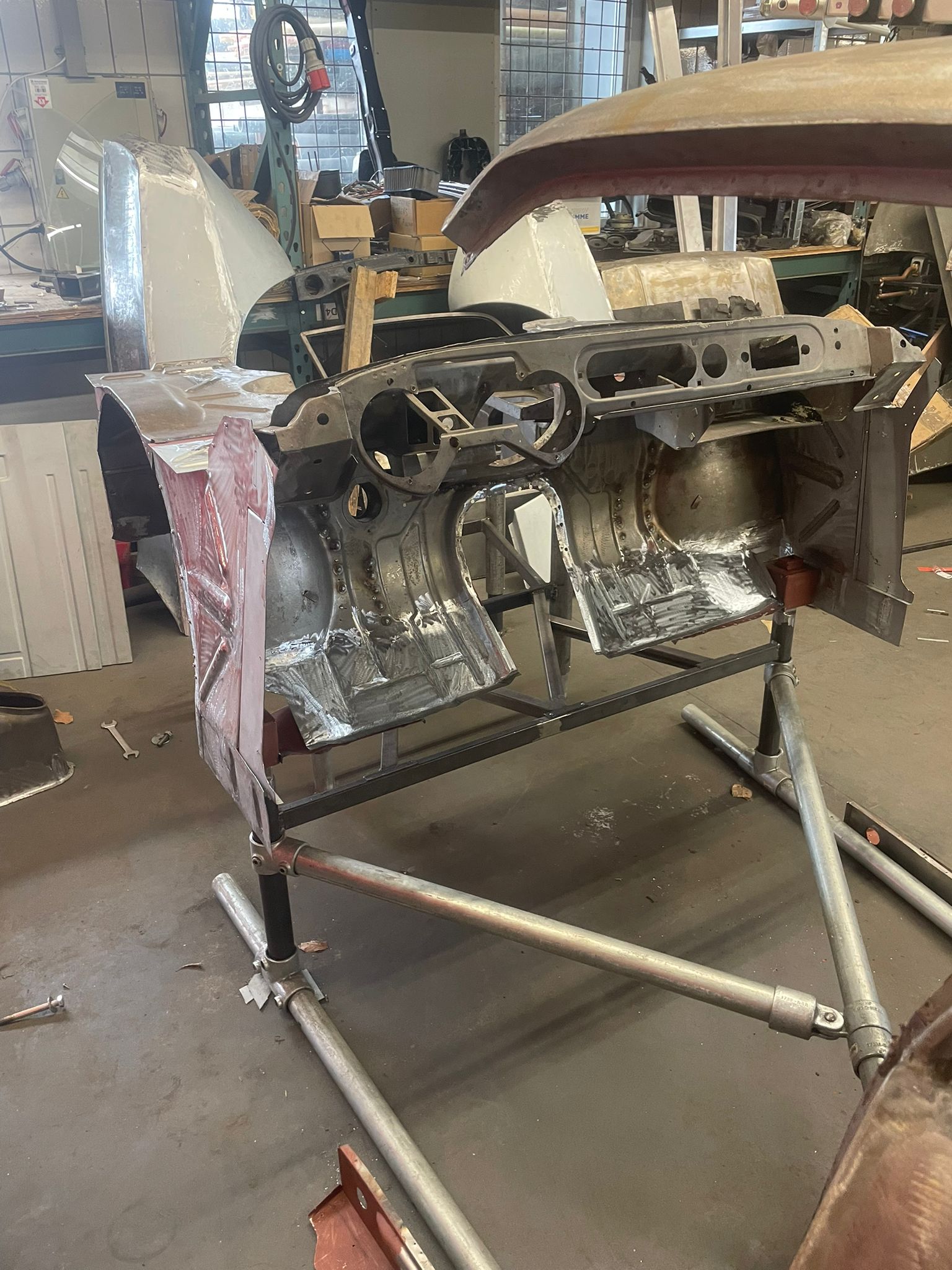 Another week on the zagato. Not a lot of pictures but a lot has happened. I repaired the uppercorners of the firewall. Changed the side profile of the driversside to match the passengerside. Knocked out some dents and stretched the driversside a little bit. Then located every stresscrack, knocked it flat and rewelded it. Remade the lower 20cm of the firewall and the passengerside already welded in after connecting the sidepanels to the firewall.