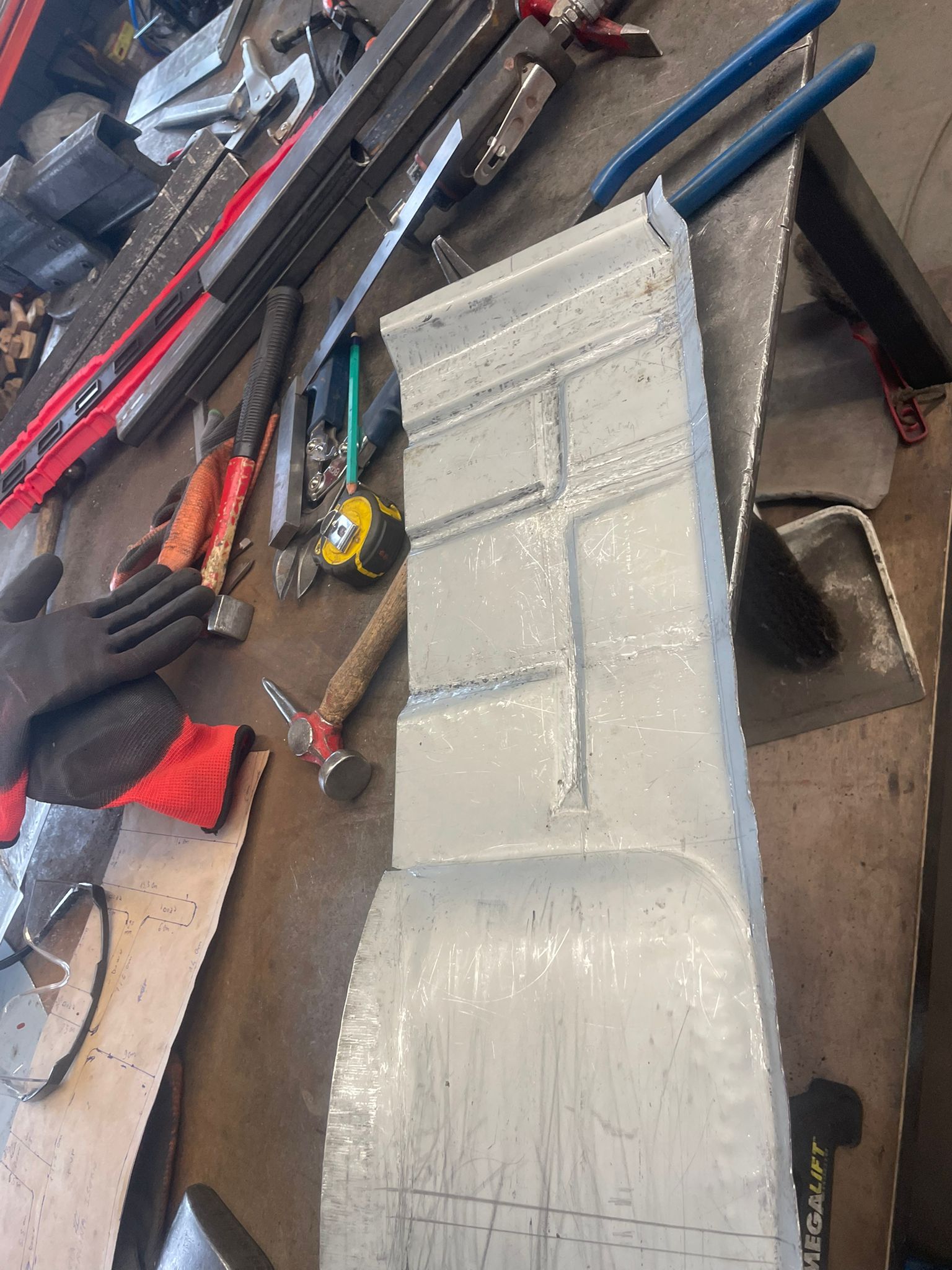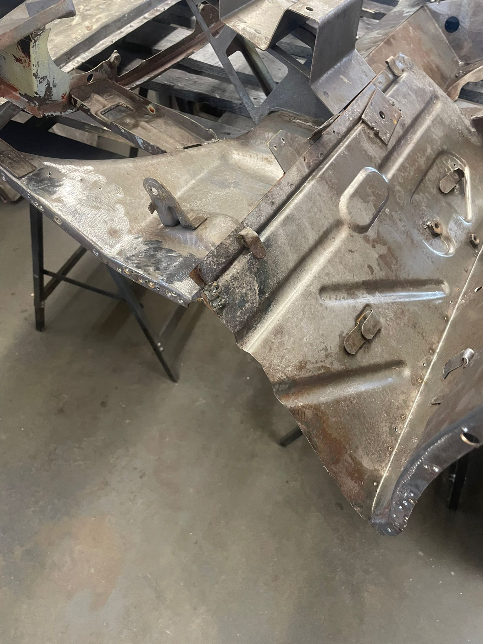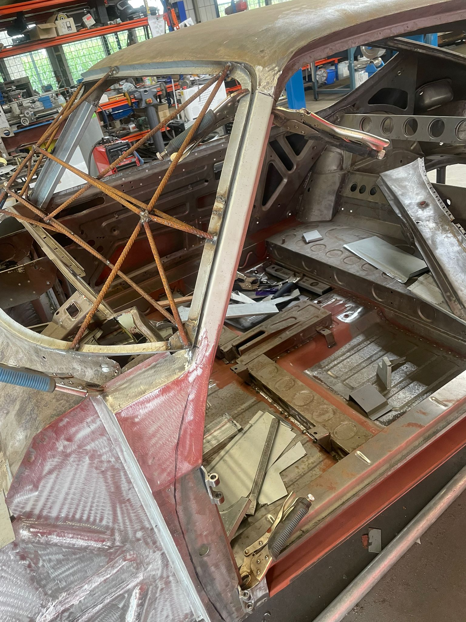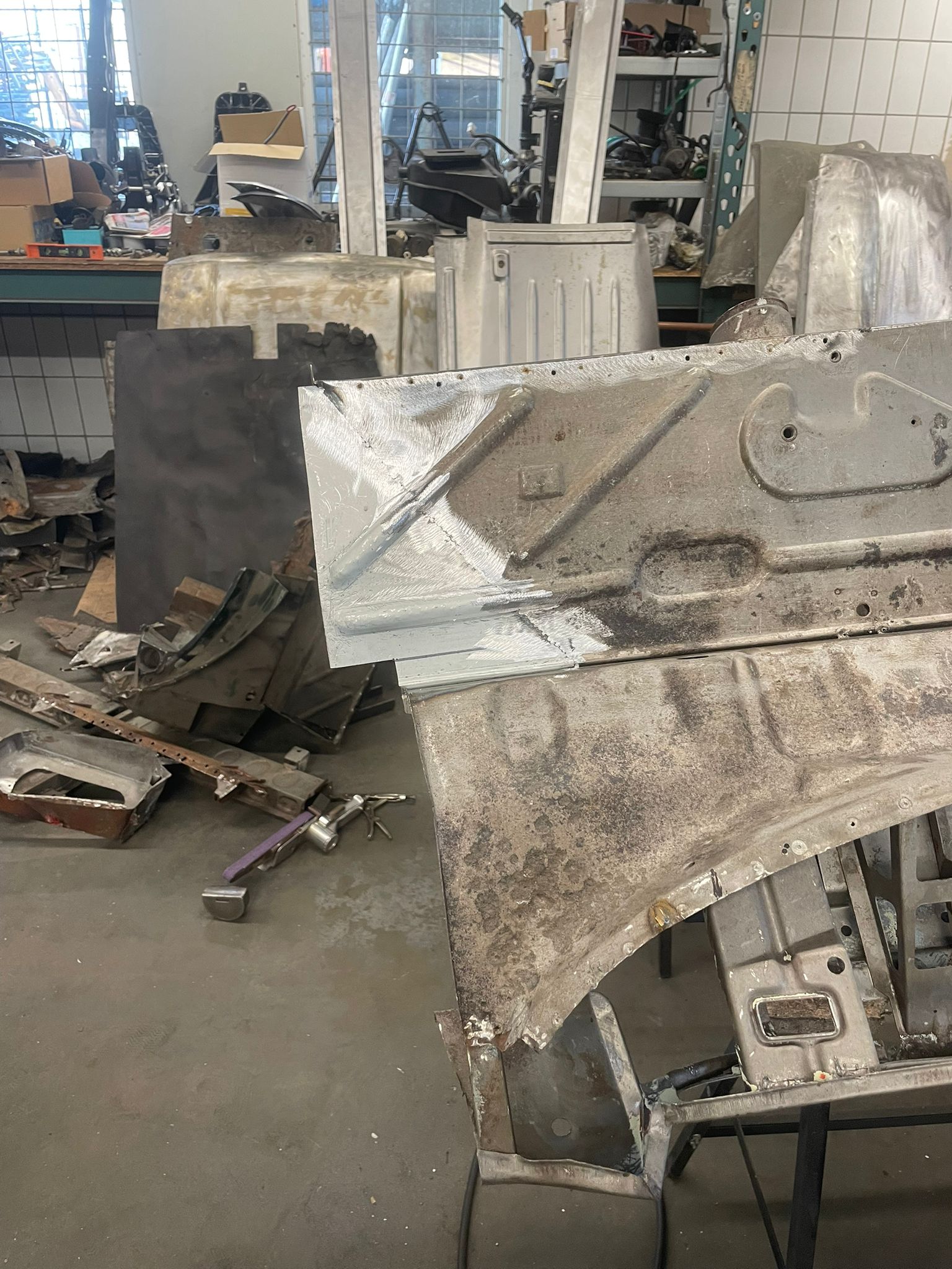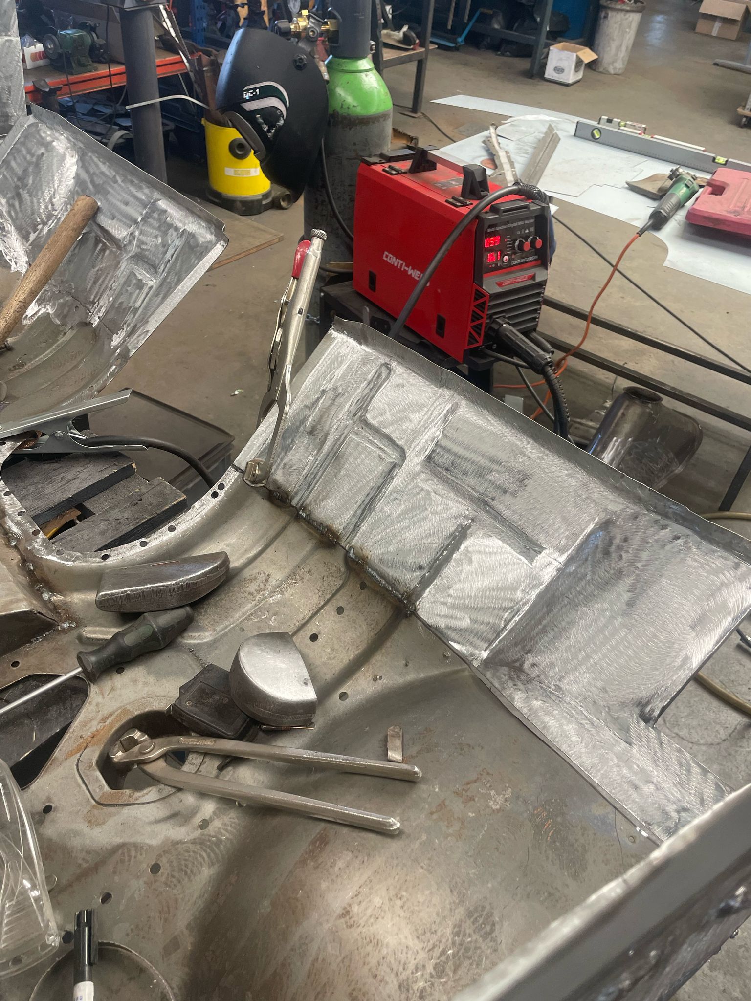 Another week on the zagato. Not a lot of pictures but a lot has happened. I repaired the uppercorners of the firewall. Changed the side profile of the driversside to match the passengerside. Knocked out some dents and stretched the driversside a little bit. Then located every stresscrack, knocked it flat and rewelded it. Remade the lower 20cm of the firewall and the passengerside already welded in after connecting the sidepanels to the firewall.
