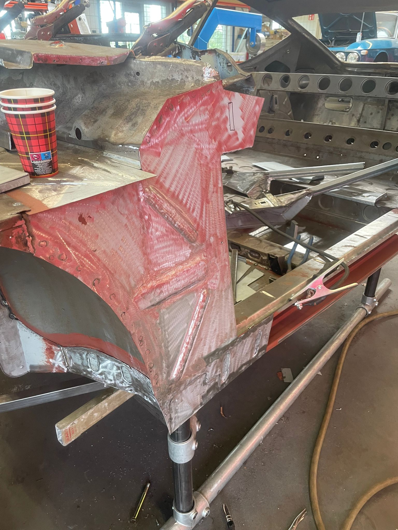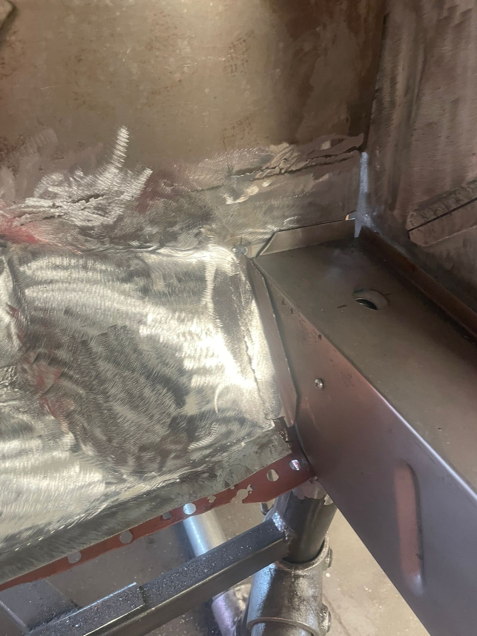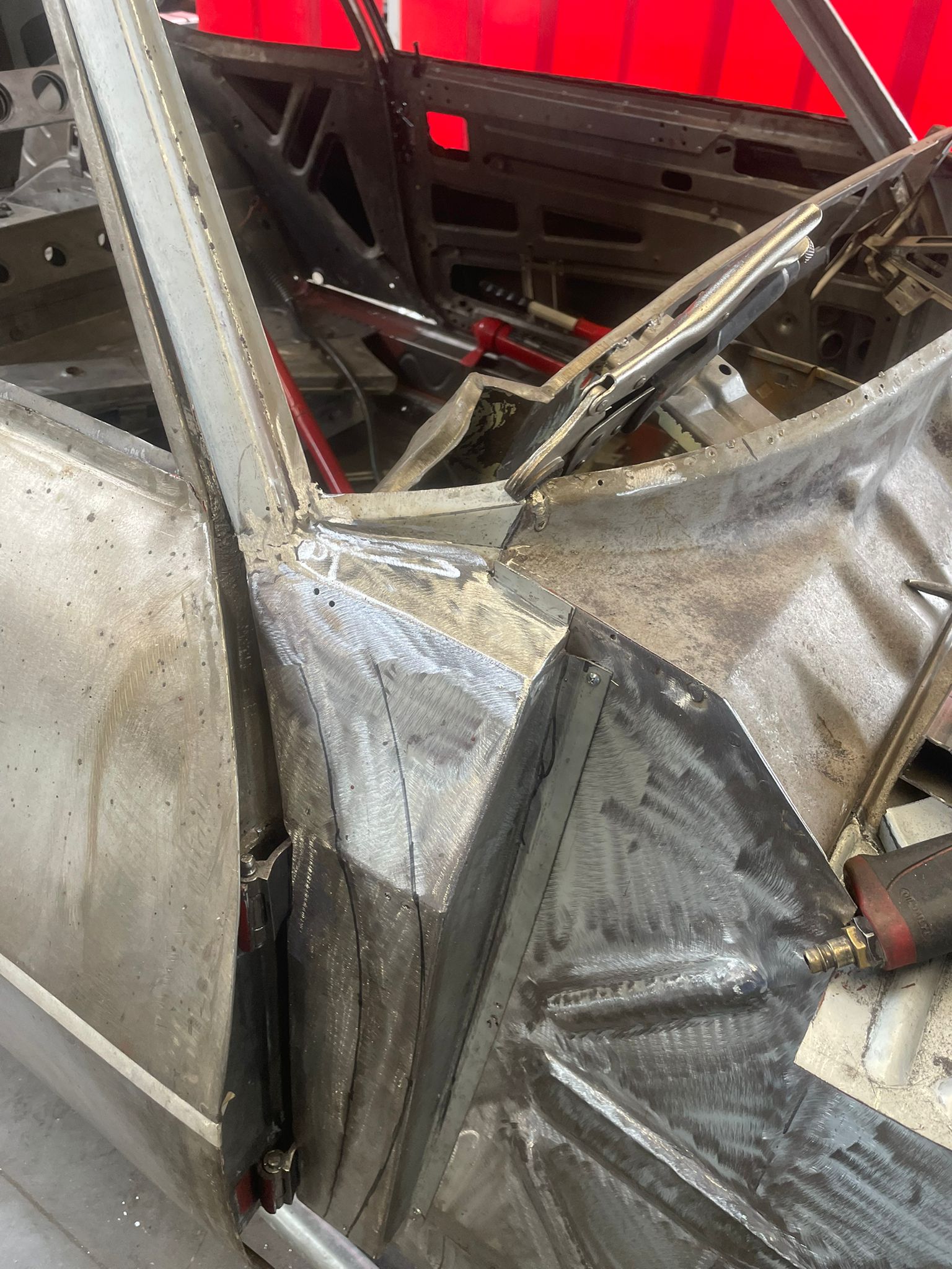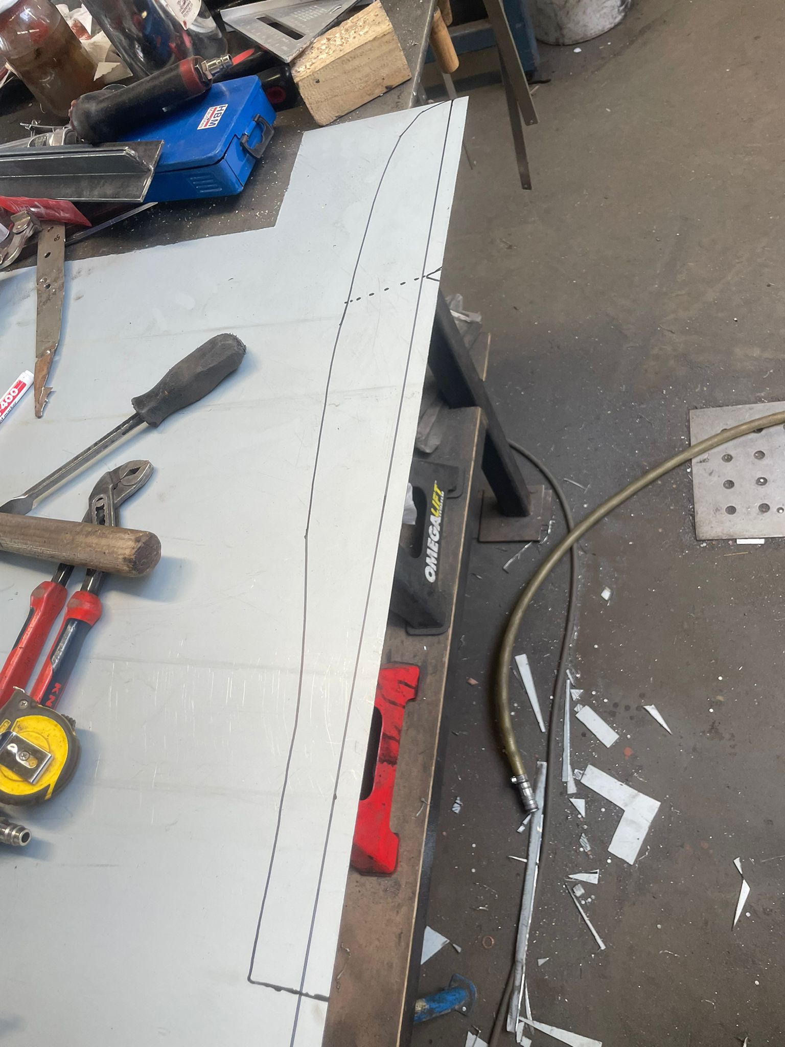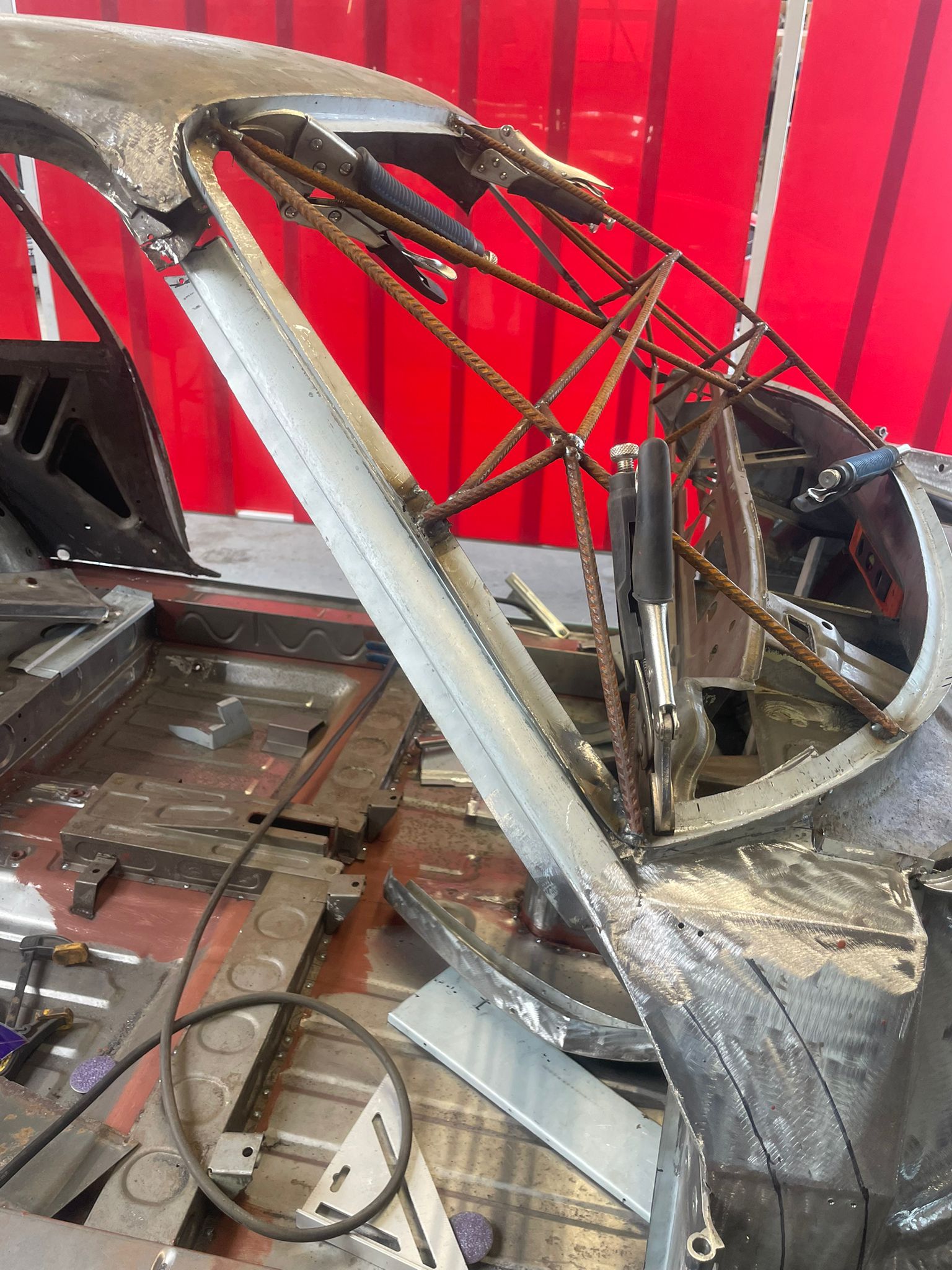 Another week on the zagato. Not a lot of pictures but a lot has happened. I repaired the uppercorners of the firewall. Changed the side profile of the driversside to match the passengerside. Knocked out some dents and stretched the driversside a little bit. Then located every stresscrack, knocked it flat and rewelded it. Remade the lower 20cm of the firewall and the passengerside already welded in after connecting the sidepanels to the firewall.