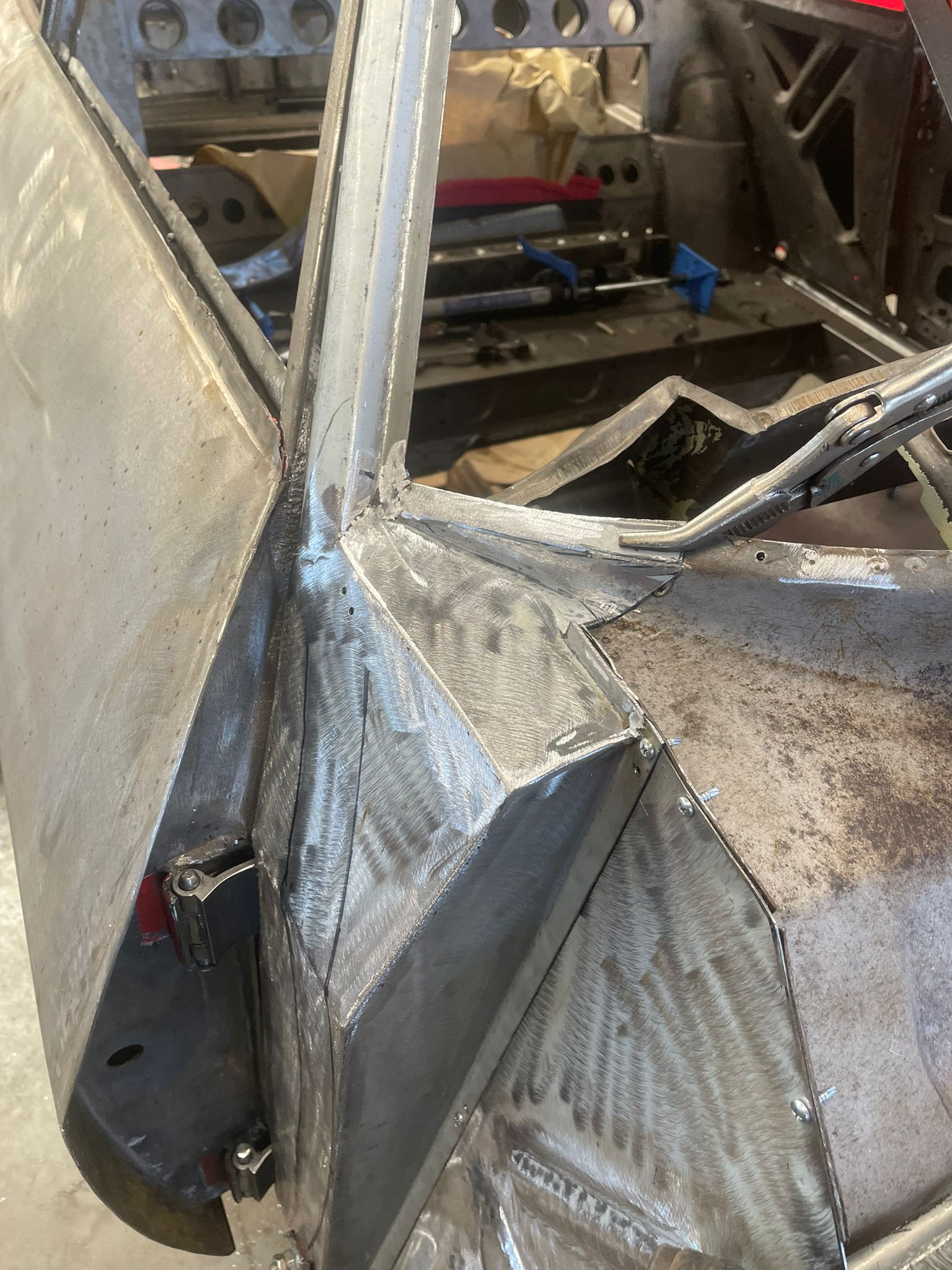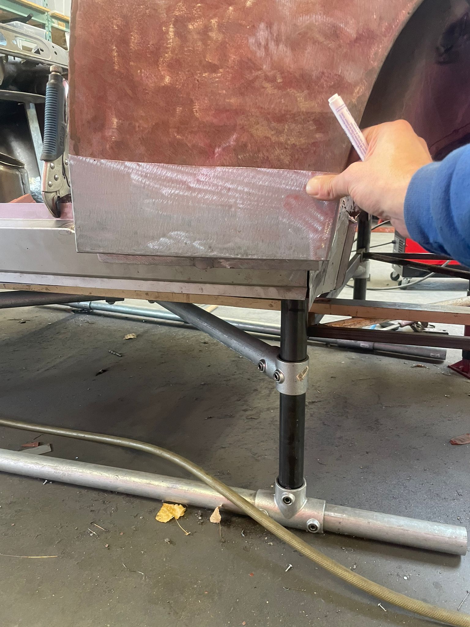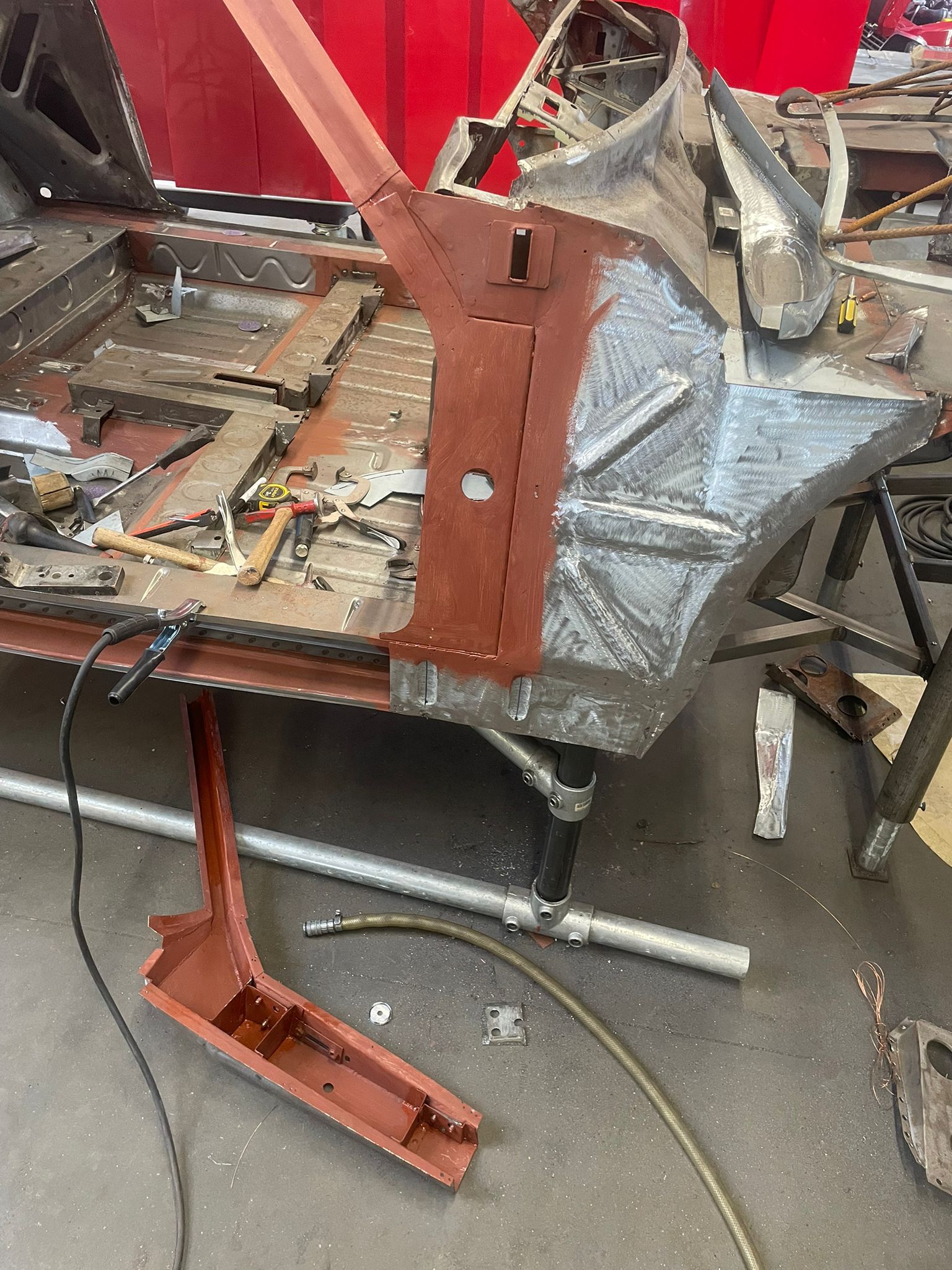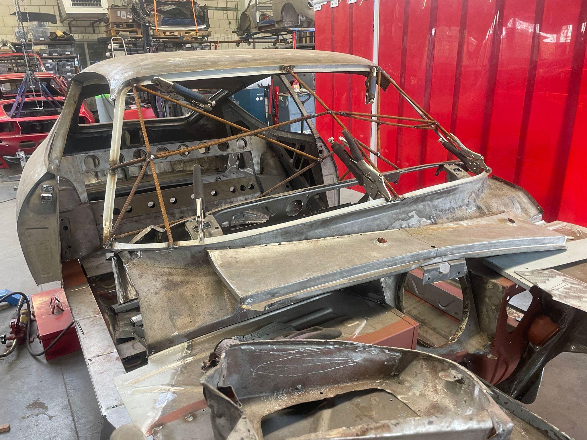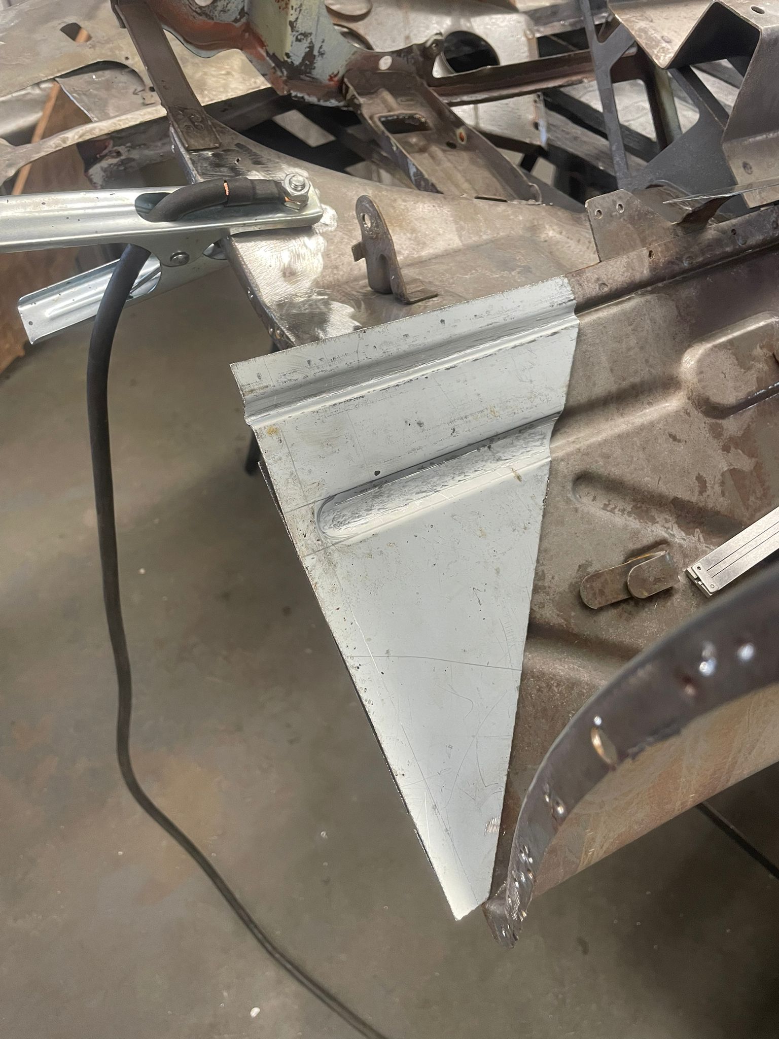 Another week on the zagato. Not a lot of pictures but a lot has happened. I repaired the uppercorners of the firewall. Changed the side profile of the driversside to match the passengerside. Knocked out some dents and stretched the driversside a little bit. Then located every stresscrack, knocked it flat and rewelded it. Remade the lower 20cm of the firewall and the passengerside already welded in after connecting the sidepanels to the firewall.