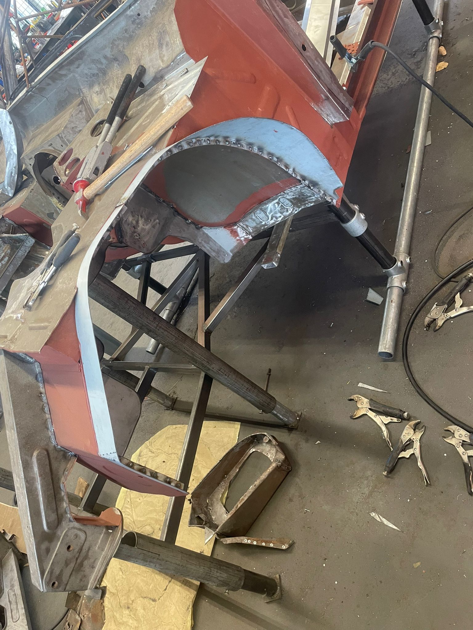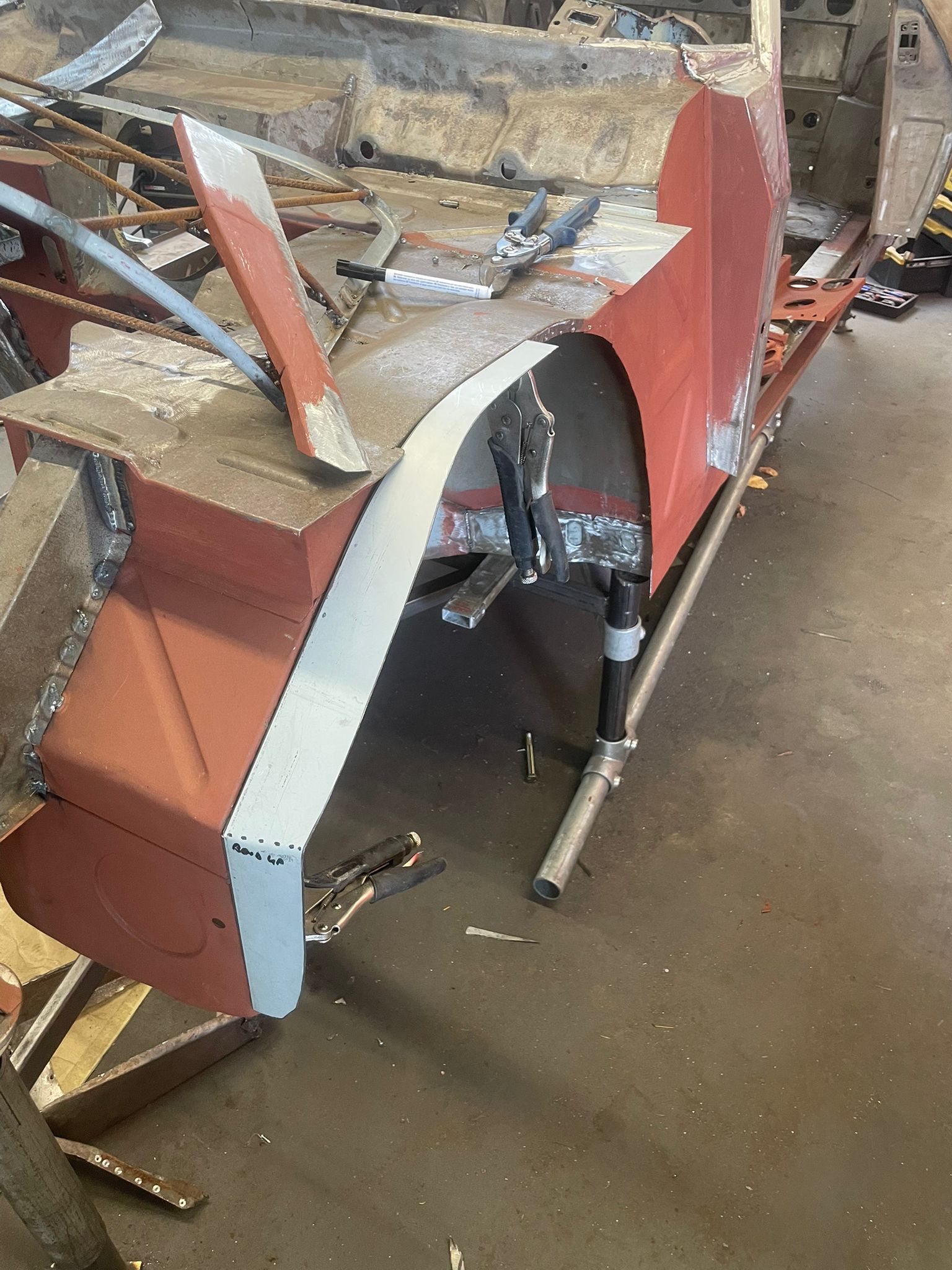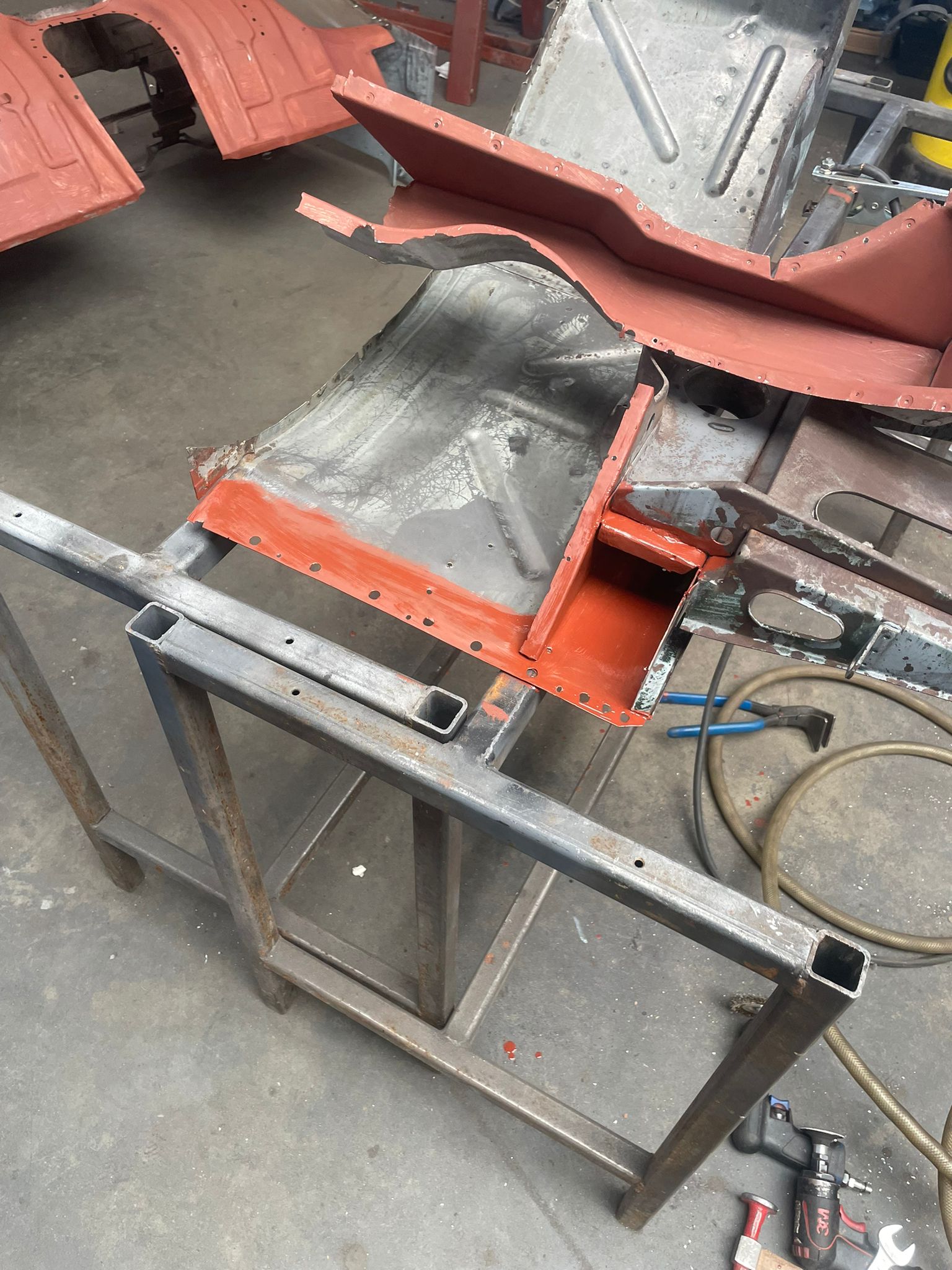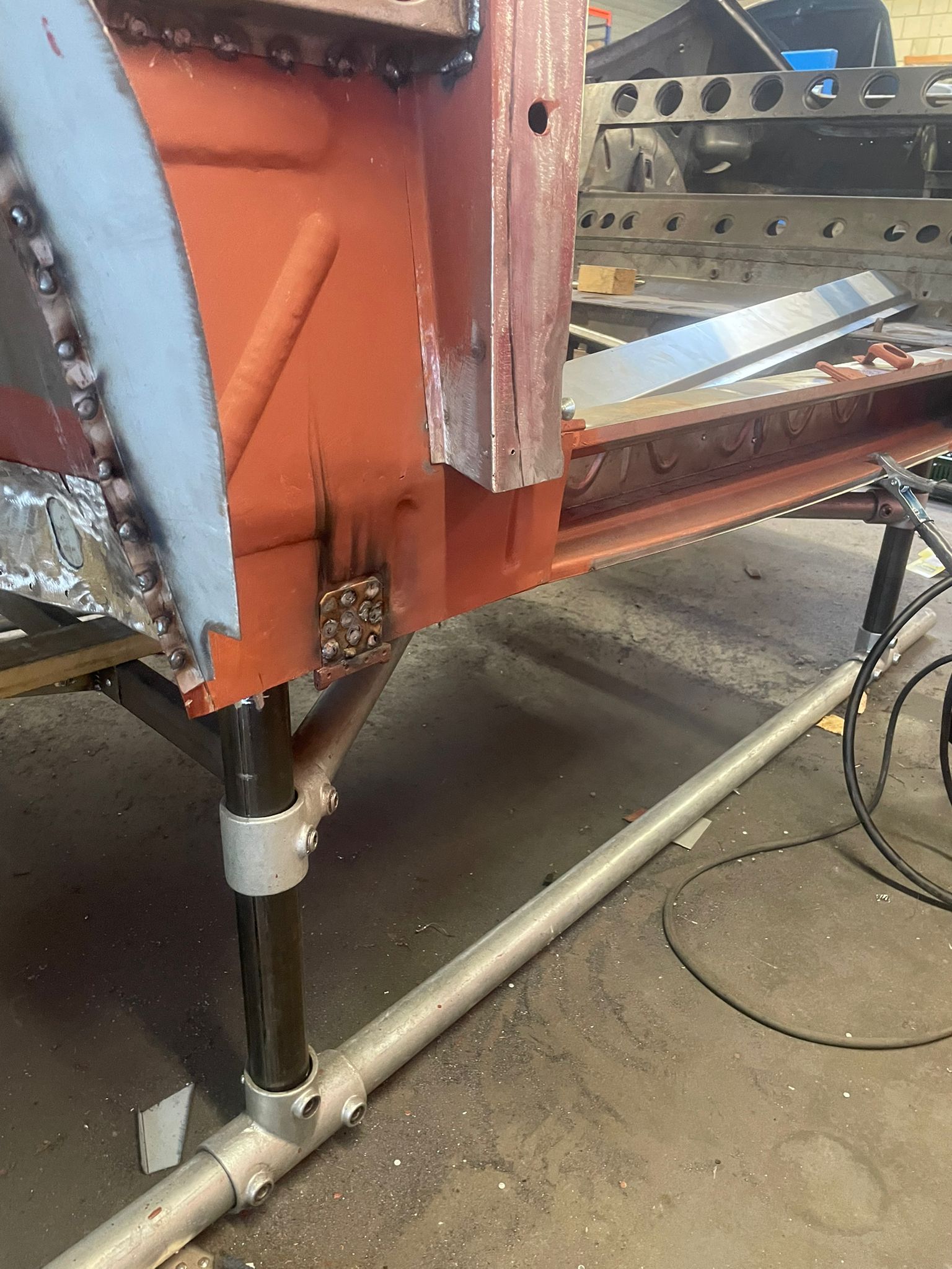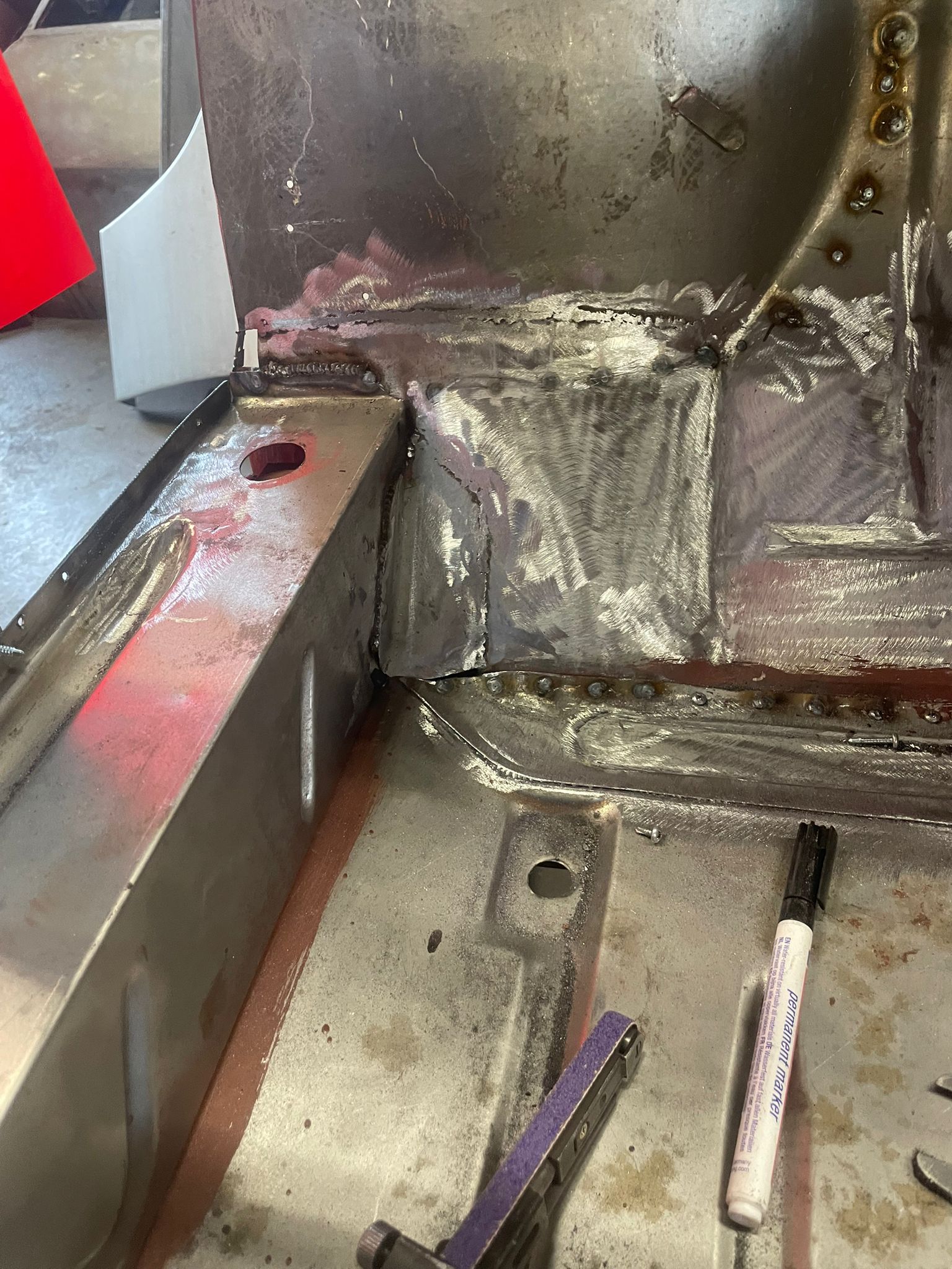Another week on the zagato. Not a lot of pictures but a lot has happened. I repaired the uppercorners of the firewall. Changed the side profile of the driversside to match the passengerside. Knocked out some dents and stretched the driversside a little bit. Then located every stresscrack, knocked it flat and rewelded it. Remade the lower 20cm of the firewall and the passengerside already welded in after connecting the sidepanels to the firewall.